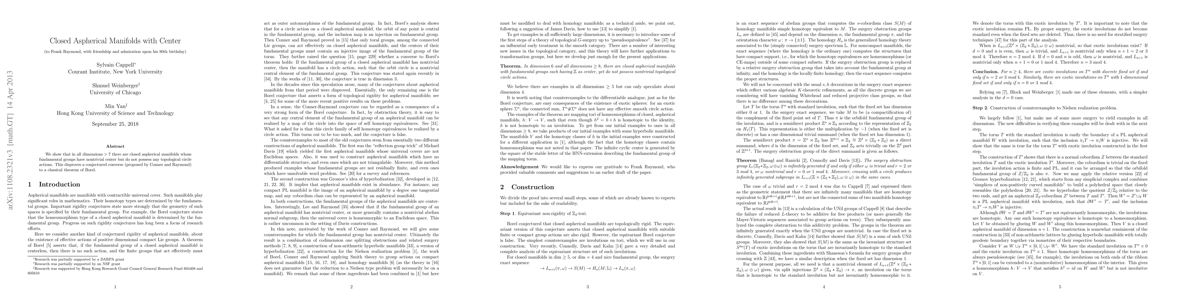 We show that in all dimensions >7 there are closed aspherical manifolds whose fundamental groups have nontrivial center but do not possess any topological circle actions. This disproves a conjectured converse (proposed by Conner and Raymond) to a classical theorem of Borel.
