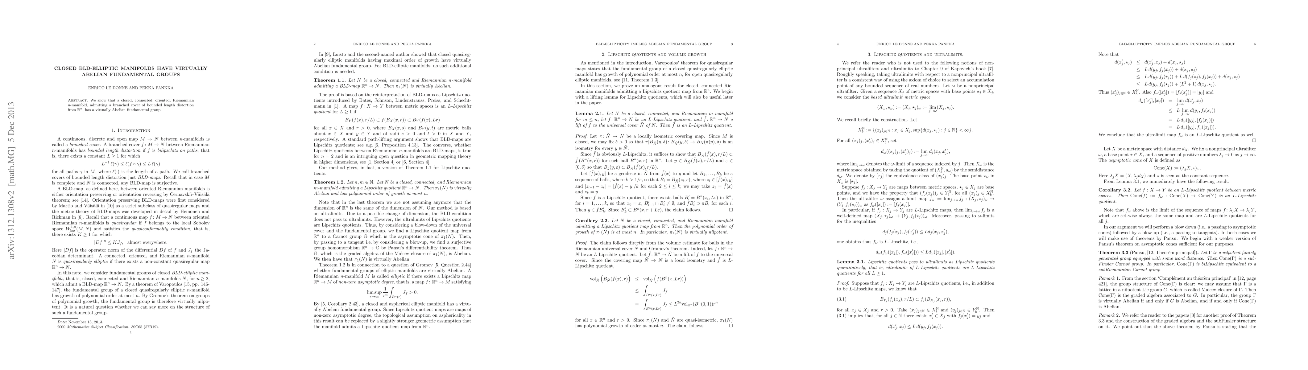 Summary: This paper demonstrates that closed, connected, oriented Riemannian manifolds with a branched cover of bounded length distortion from $\mathbb R^n$ possess virtually Abelian fundamental groups. The result establishes a connection between geometric properties of the manifold and algebraic structure of its fundamental group.