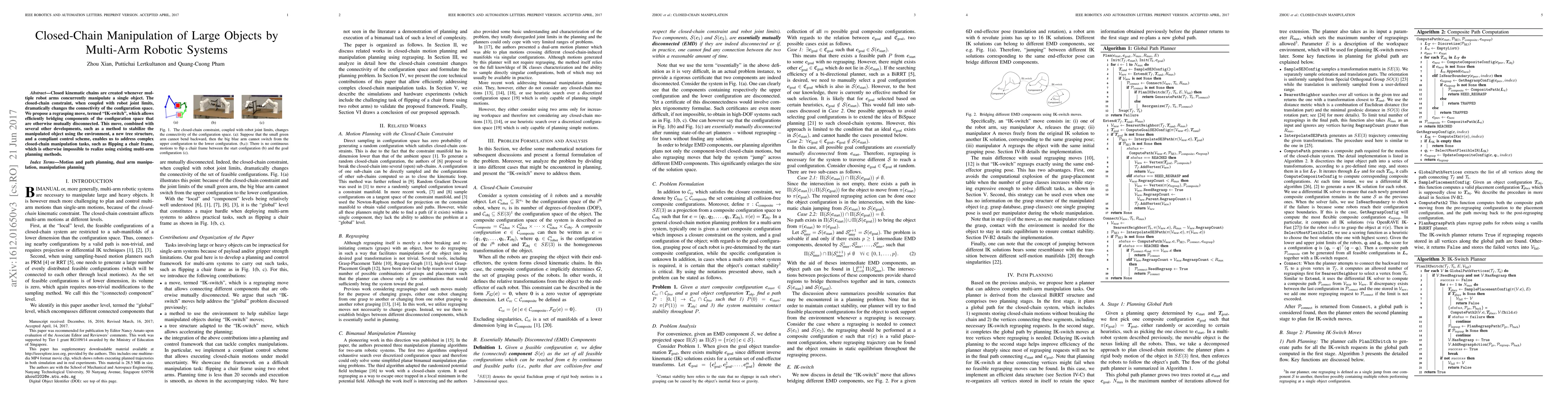 Closed kinematic chains are created whenever multiple robot arms concurrently manipulate a single object. The closed-chain constraint, when coupled with robot joint limits, dramatically changes the connectivity of the configuration space. We propose a regrasping move, termed "IK-switch", which allows efficiently bridging components of the configuration space that are otherwise mutually disconnected. This move, combined with several other developments, such as a method to stabilize the manipulated object using the environment, a new tree structure, and a compliant control scheme, enables us to address complex closed-chain manipulation tasks, such as flipping a chair frame, which is otherwise impossible to realize using existing multi-arm planning methods.