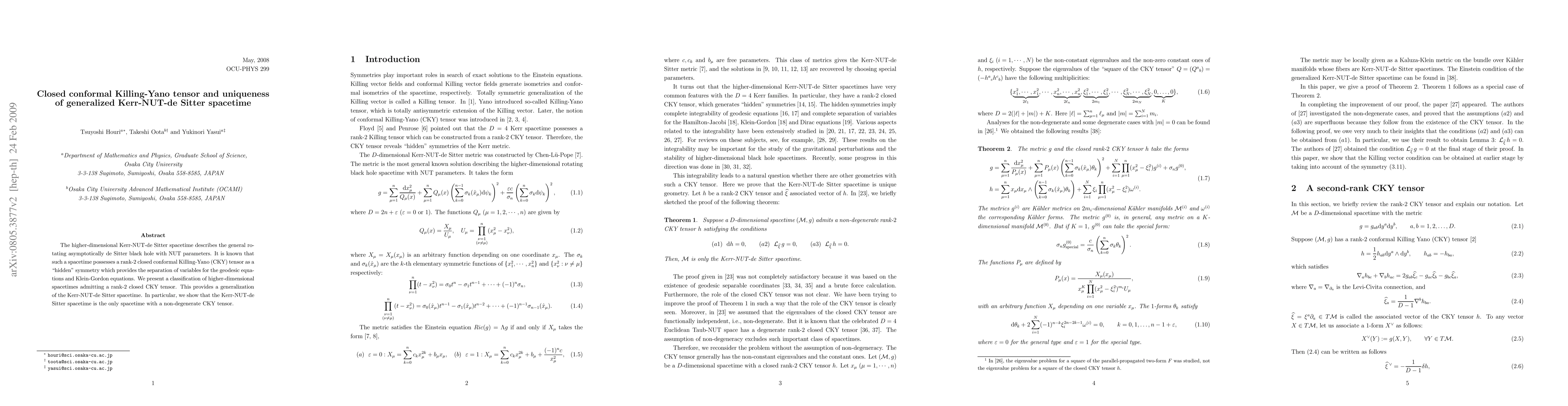 This paper classifies higher-dimensional spacetimes with a rank-2 closed conformal Killing-Yano tensor, revealing that the generalized Kerr-NUT-de Sitter spacetime is unique in possessing a non-degenerate tensor. The study emphasizes the spacetime's "hidden" symmetry and its role in solving geodesic and Klein-Gordon equations.
