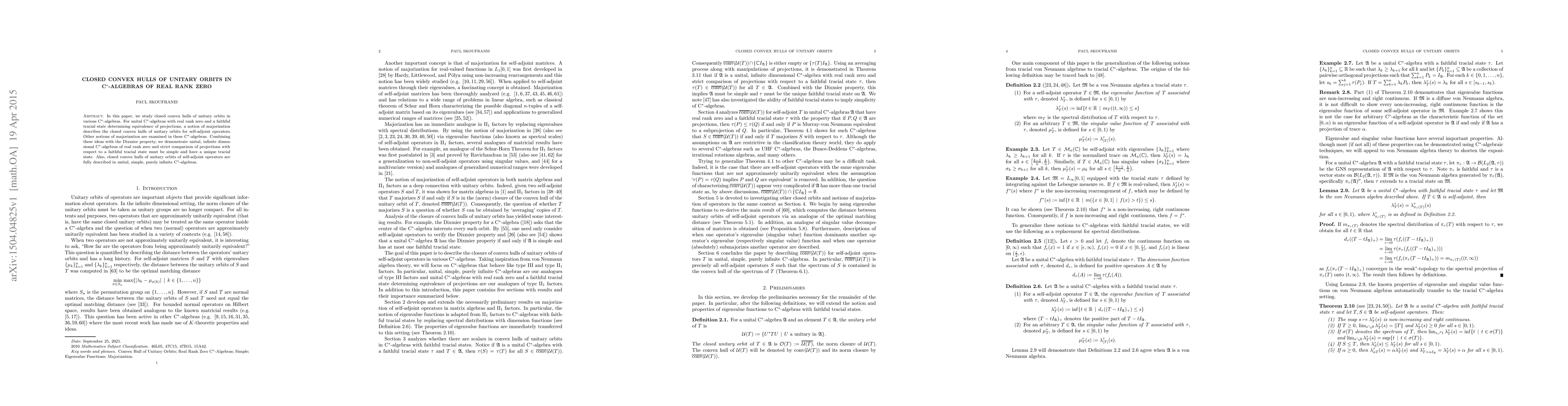 In this paper, we study closed convex hulls of unitary orbits in various C$^*$-algebras. For unital C$^*$-algebras with real rank zero and a faithful tracial state determining equivalence of projections, a notion of majorization describes the closed convex hulls of unitary orbits for self-adjoint operators. Other notions of majorization are examined in these C$^*$-algebras. Combining these ideas with the Dixmier property, we demonstrate unital, infinite dimensional C$^*$-algebras of real rank zero and strict comparison of projections with respect to a faithful tracial state must be simple and have a unique tracial state. Also, closed convex hulls of unitary orbits of self-adjoint operators are fully described in unital, simple, purely infinite C$^*$-algebras.
