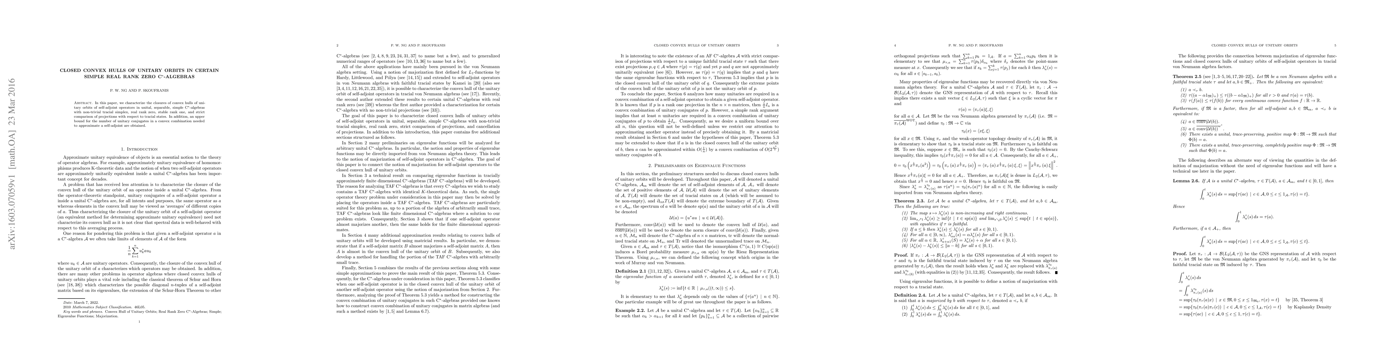 In this paper, we characterize the closures of convex hulls of unitary orbits of self-adjoint operators in unital, separable, simple C$^*$-algebras with non-trivial tracial simplex, real rank zero, stable rank one, and strict comparison of projections with respect to tracial states. In addition, an upper bound for the number of unitary conjugates in a convex combination needed to approximate a self-adjoint are obtained.