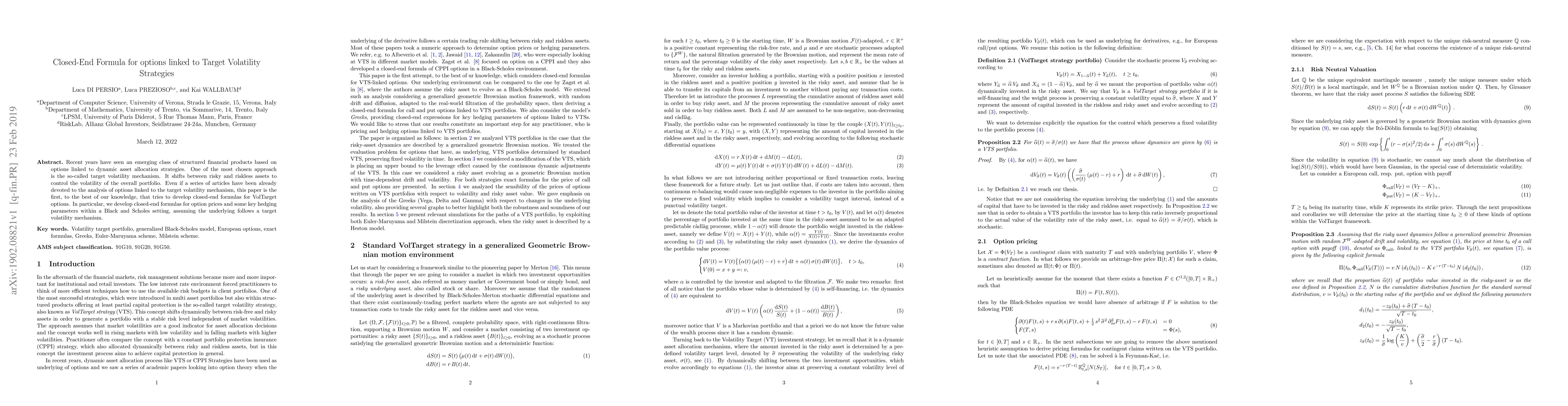 Recent years have seen an emerging class of structured financial products based on options linked to dynamic asset allocation strategies. One of the most chosen approach is the so-called target volatility mechanism. It shifts between risky and riskless assets to control the volatility of the overall portfolio. Even if a series of articles have been already devoted to the analysis of options linked to the target volatility mechanism, this paper is the first, to the best of our knowledge, that tries to develop closed-end formulas for VolTarget options. In particular, we develop closed-end formulas for option prices and some key hedging parameters within a Black and Scholes setting, assuming the underlying follows a target volatility mechanism.
