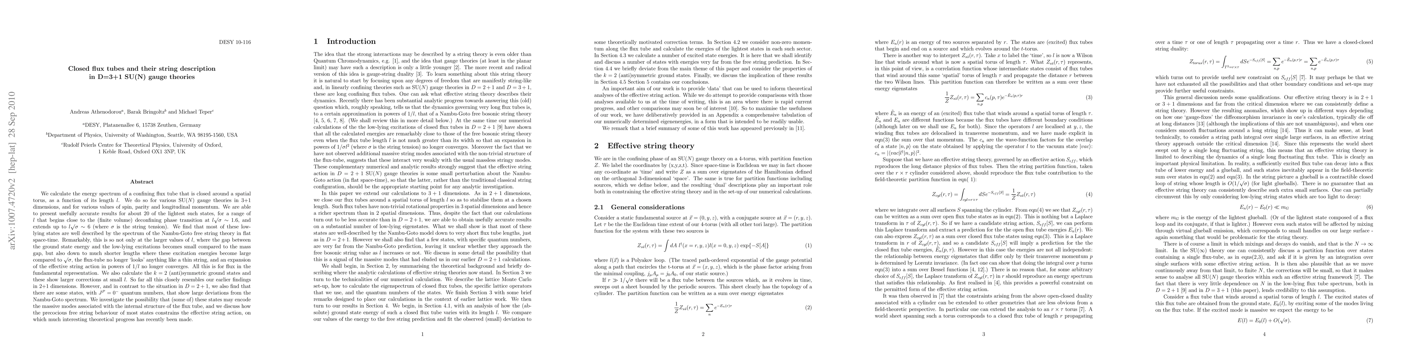This paper calculates the energy spectrum of closed flux tubes in D=3+1 SU(N) gauge theories, finding that most low-lying states closely resemble the Nambu-Goto string theory spectrum even at short lengths. However, some states with J,P=0,− quantum numbers deviate significantly, potentially encoding internal flux tube structure.