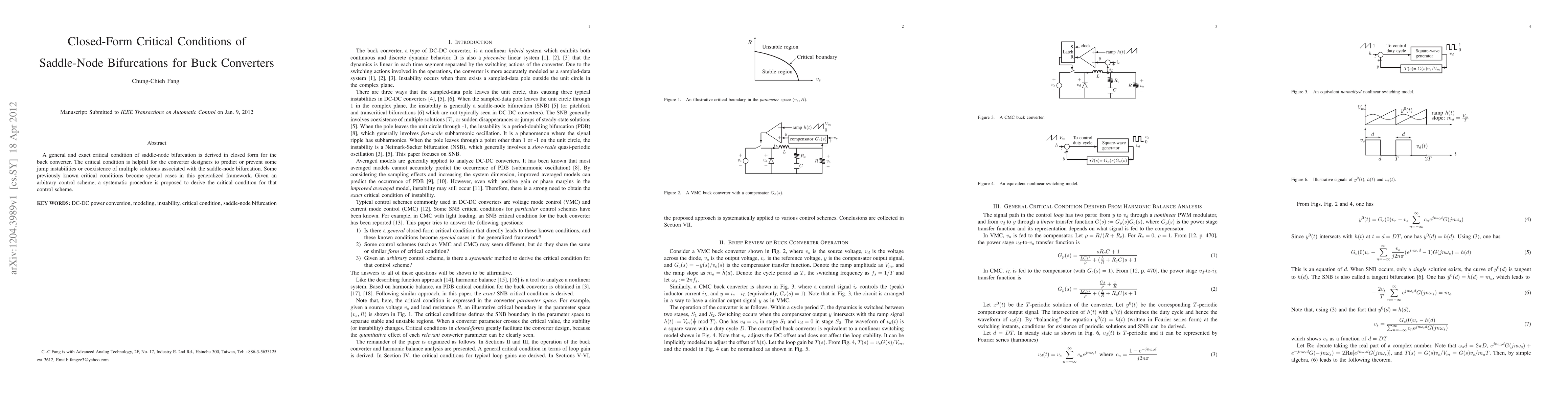 This paper derives a closed-form critical condition for saddle-node bifurcations in buck converters, aiding designers in predicting and preventing instabilities. The proposed method generalizes previous conditions and provides a systematic approach for any control scheme.