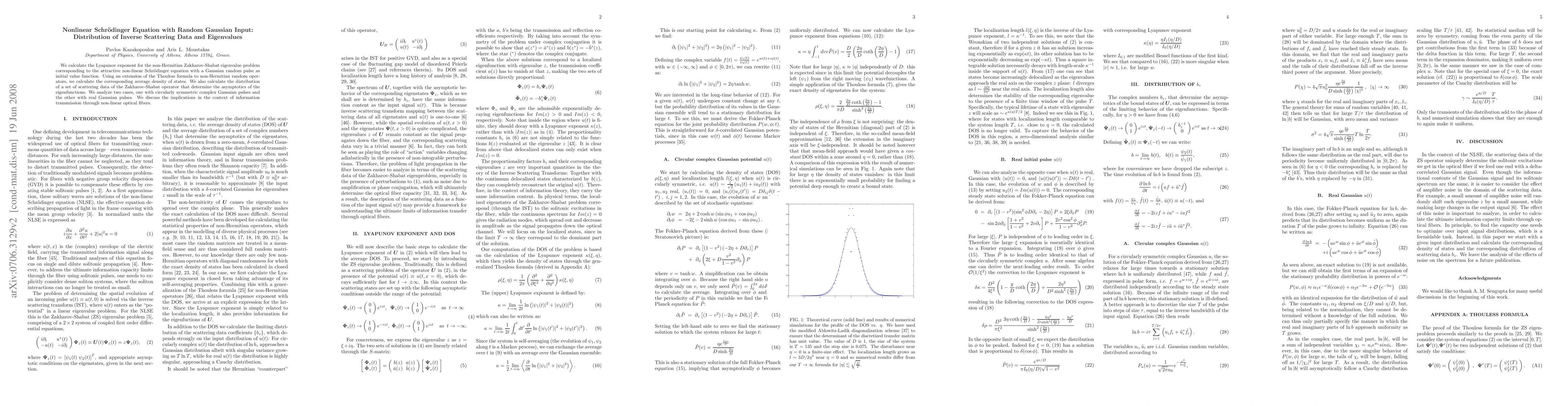 We calculate the Lyapunov exponent for the non-Hermitian Zakharov-Shabat eigenvalue problem corresponding to the attractive non-linear Schroedinger equation with a Gaussian random pulse as initial value function. Using an extension of the Thouless formula to non-Hermitian random operators, we calculate the corresponding average density of states. We analyze two cases, one with circularly symmetric complex Gaussian pulses and the other with real Gaussian pulses. We discuss the implications in the context of the information transmission through non-linear optical fibers.