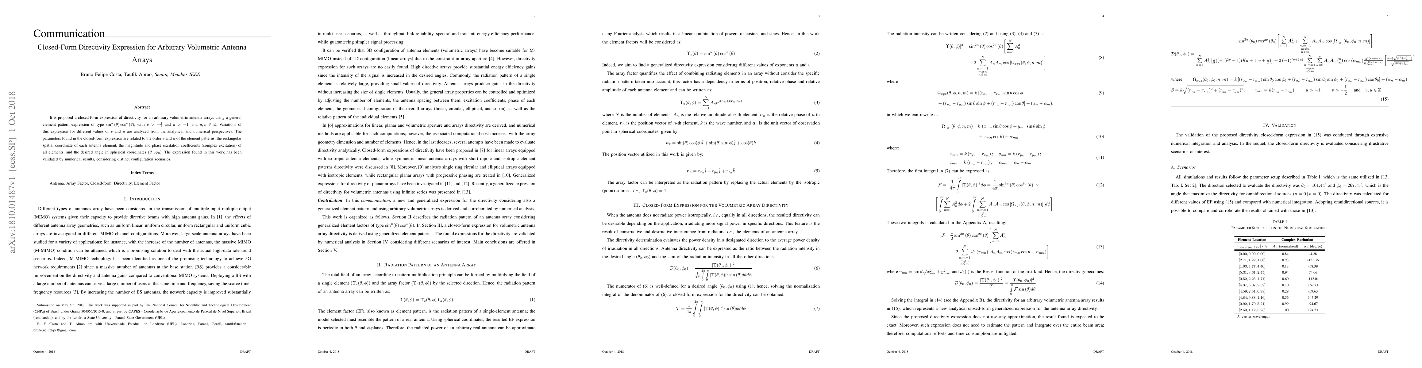 This paper proposes a closed-form expression for the directivity of arbitrary volumetric antenna arrays using a general element pattern. It validates the expression through analytical and numerical methods, relating parameters to element pattern orders, antenna element coordinates, and excitation coefficients.
