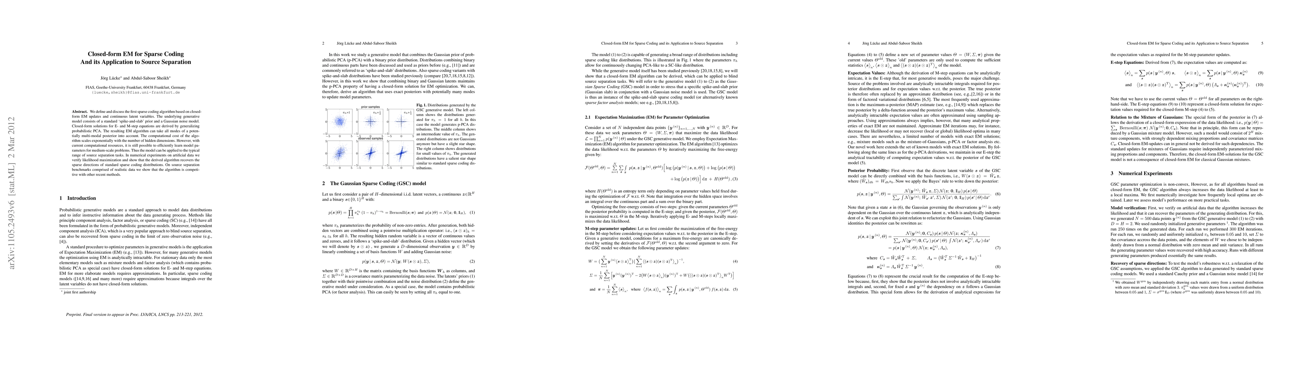 This paper introduces a closed-form EM algorithm for sparse coding using continuous latent variables, demonstrating its effectiveness for source separation tasks. The algorithm maximizes likelihood and recovers sparse directions, showing competitive performance on both artificial and realistic data.
