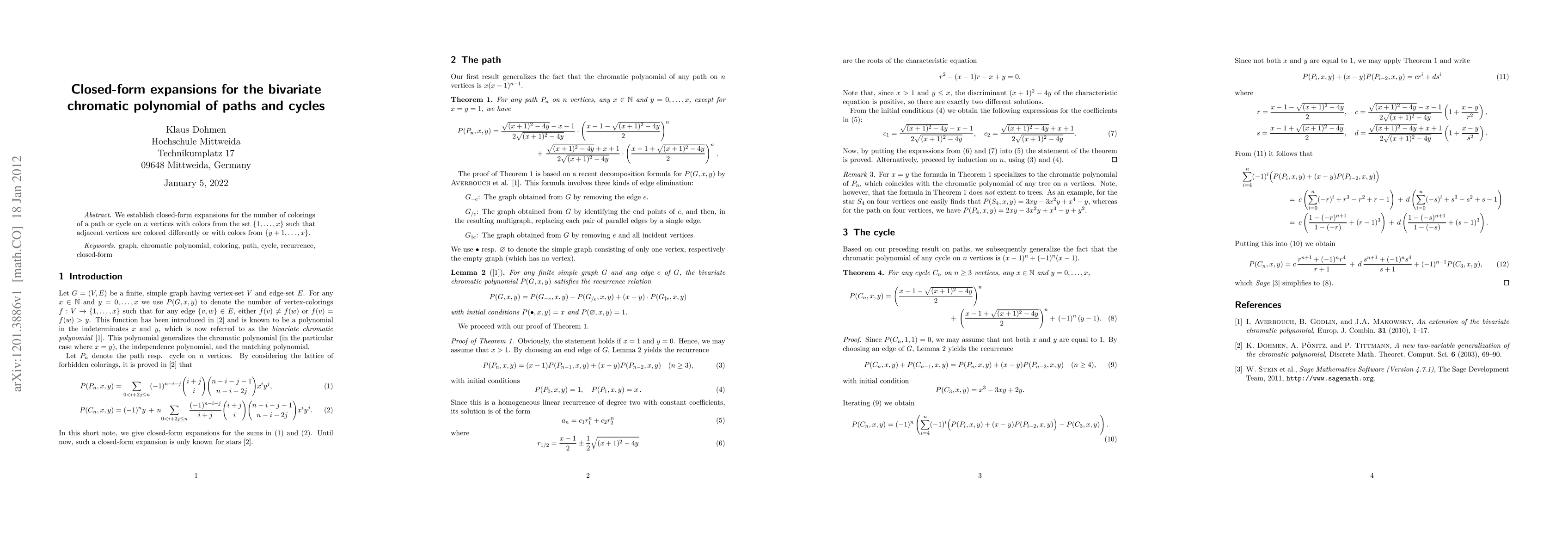 This paper presents closed-form expansions for the bivariate chromatic polynomial of paths and cycles, determining the number of ways to color these structures with colors from 1 to x while ensuring adjacent vertices have different colors or colors from y+1 to x.
