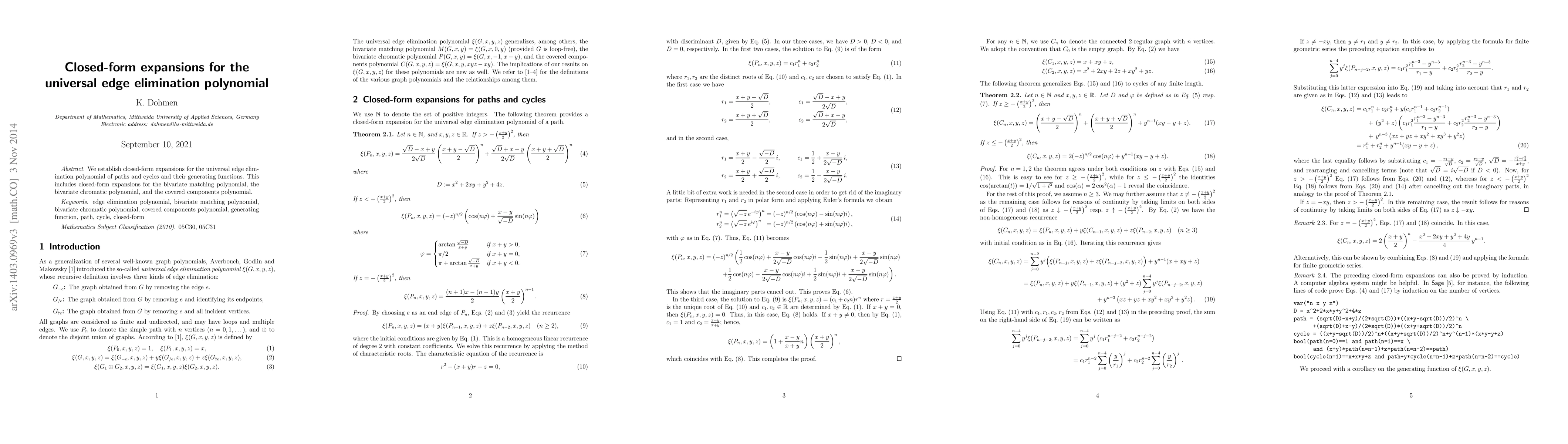 This paper presents closed-form expansions for the universal edge elimination polynomial of paths and cycles, including generating functions for the bivariate matching polynomial, the bivariate chromatic polynomial, and the covered components polynomial. The findings provide significant insights into the structural properties of these combinatorial polynomials.