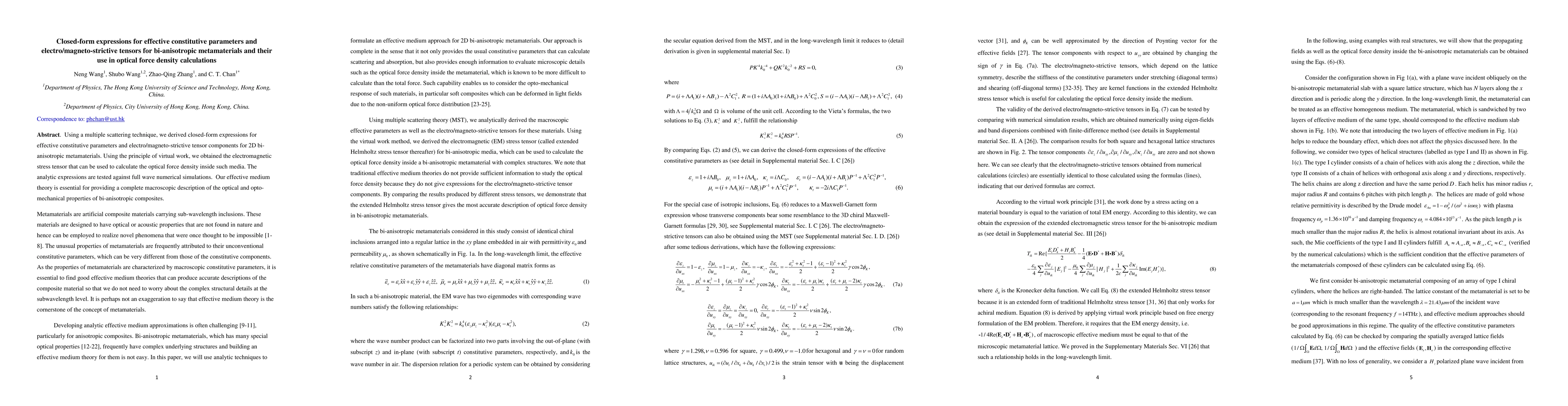 This paper derives closed-form expressions for effective constitutive parameters and electro/magneto-strictive tensors for 2D bi-anisotropic metamaterials using a multiple scattering technique. It employs the principle of virtual work to calculate optical force density, validated by full wave numerical simulations, providing a comprehensive macroscopic description of their optical and opto-mechanical properties.