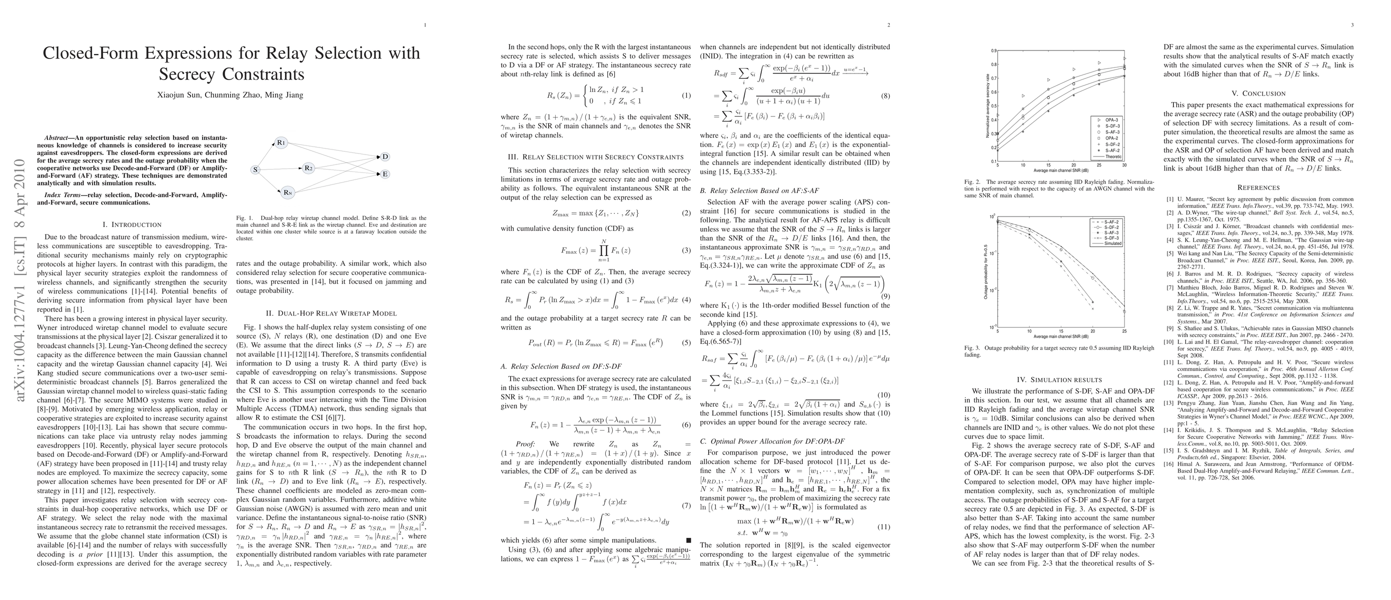 This paper derives closed-form expressions for average secrecy rates and outage probability in relay selection with secrecy constraints for cooperative networks using Decode-and-Forward or Amplify-and-Forward strategies. Analytical derivations are supported by simulation results.