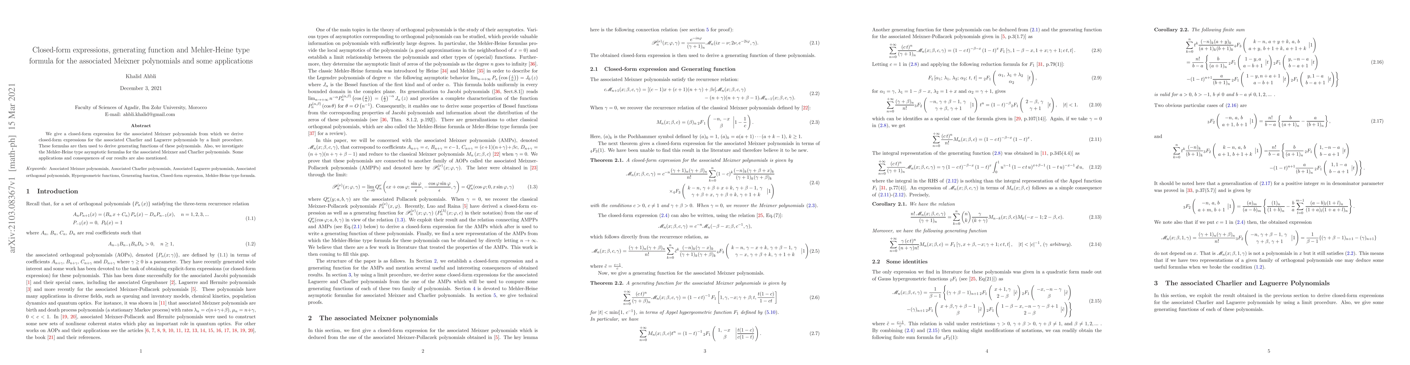 Summary: This paper provides closed-form expressions for associated Meixner, Charlier, and Laguerre polynomials, derives their generating functions, and explores Mehler-Heine type asymptotic formulas, highlighting applications and implications of these findings.