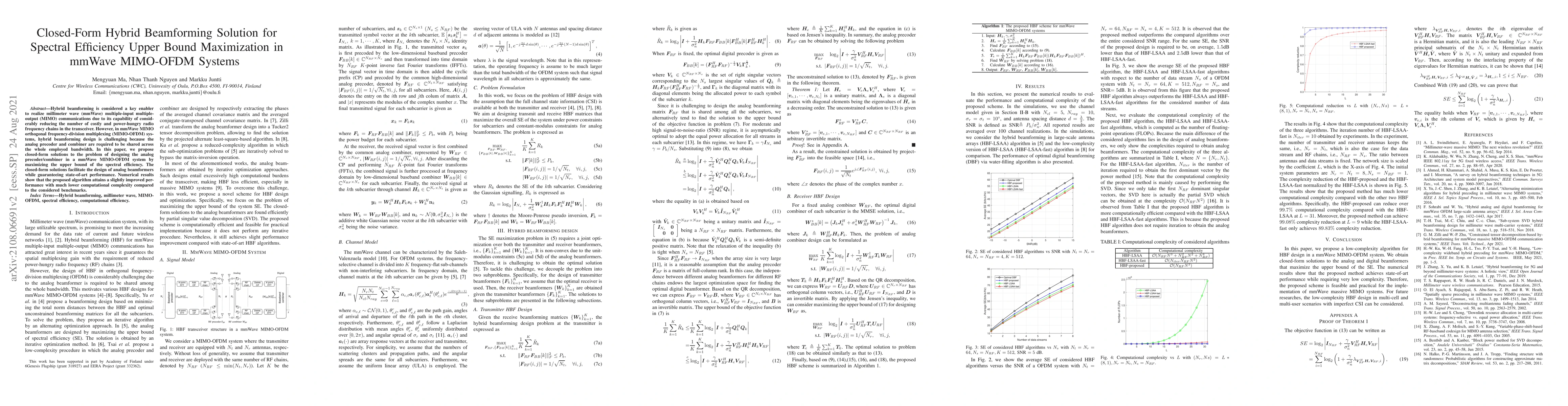 The paper proposes closed-form solutions for hybrid beamforming (HBF) design in mmWave MIMO-OFDM systems, maximizing the spectral efficiency (SE) upper bound. It decouples the problem into transmitter and receiver beamformers, simplifying the design process.