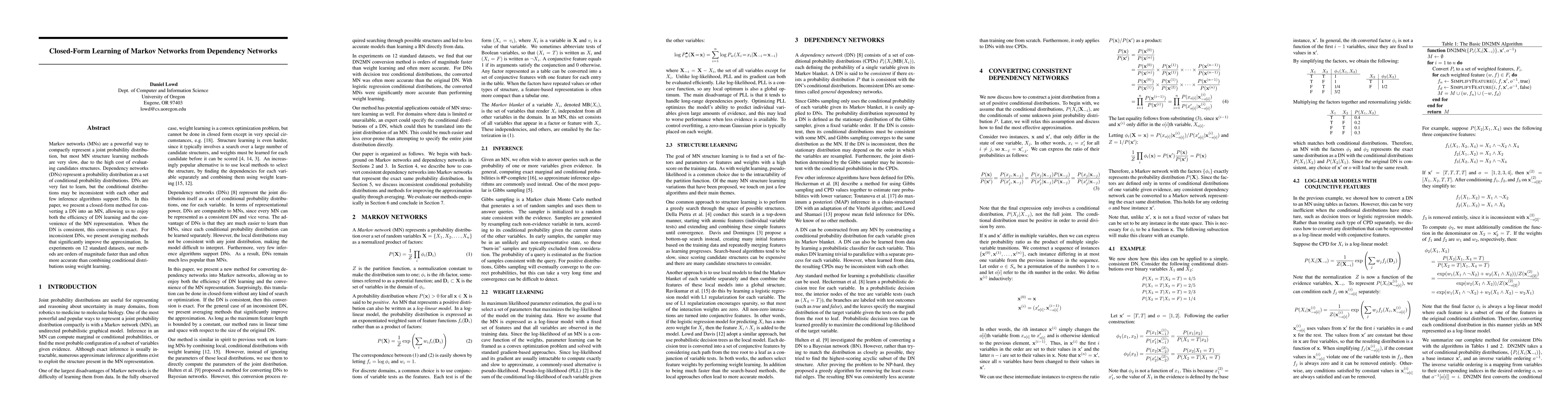 This paper proposes a closed-form method to efficiently convert dependency networks (DNs) into Markov networks (MNs), combining the fast learning of DNs with the probabilistic completeness of MNs. The method is exact for consistent DNs and uses averaging techniques for inconsistent DNs, showing significant speed and often improved accuracy over traditional weight learning methods.