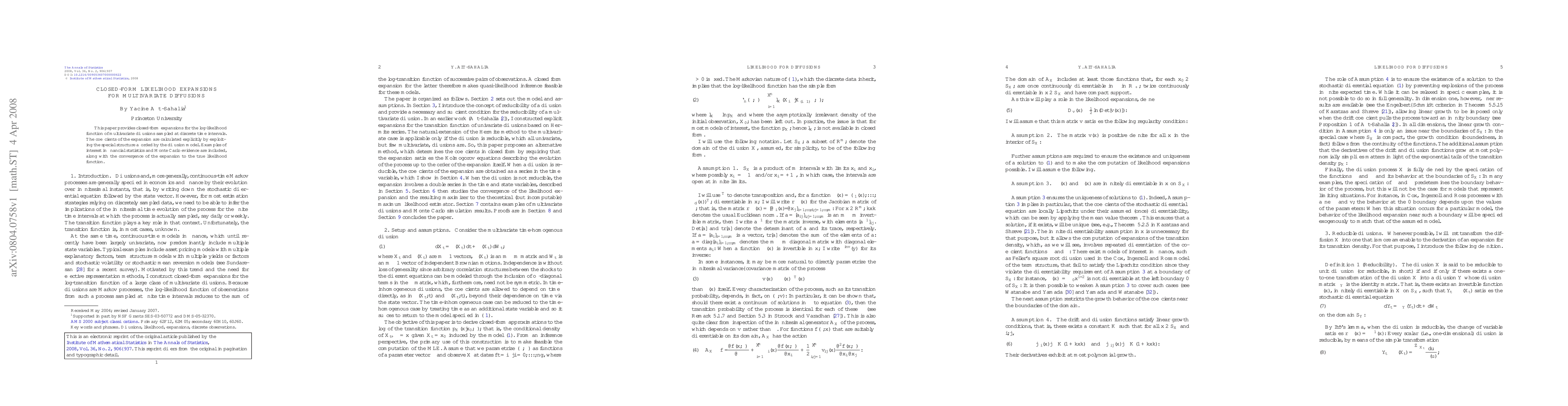 This paper presents closed-form expansions for the log-likelihood function of multivariate diffusions sampled at discrete intervals, with explicit coefficient calculations leveraging the diffusion model's structure. It includes applications in financial statistics and demonstrates the expansion's convergence to the true likelihood function.
