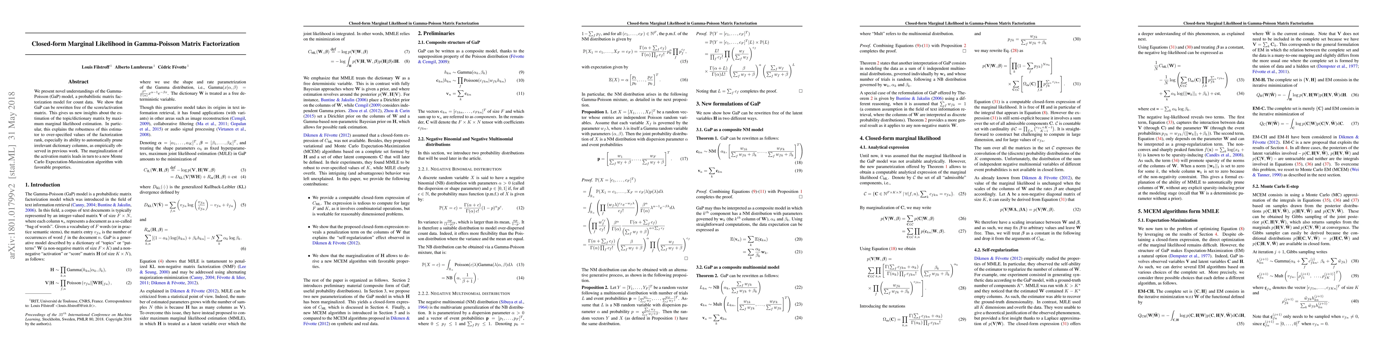 We present novel understandings of the Gamma-Poisson (GaP) model, a probabilistic matrix factorization model for count data. We show that GaP can be rewritten free of the score/activation matrix. This gives us new insights about the estimation of the topic/dictionary matrix by maximum marginal likelihood estimation. In particular, this explains the robustness of this estimator to over-specified values of the factorization rank, especially its ability to automatically prune irrelevant dictionary columns, as empirically observed in previous work. The marginalization of the activation matrix leads in turn to a new Monte Carlo Expectation-Maximization algorithm with favorable properties.