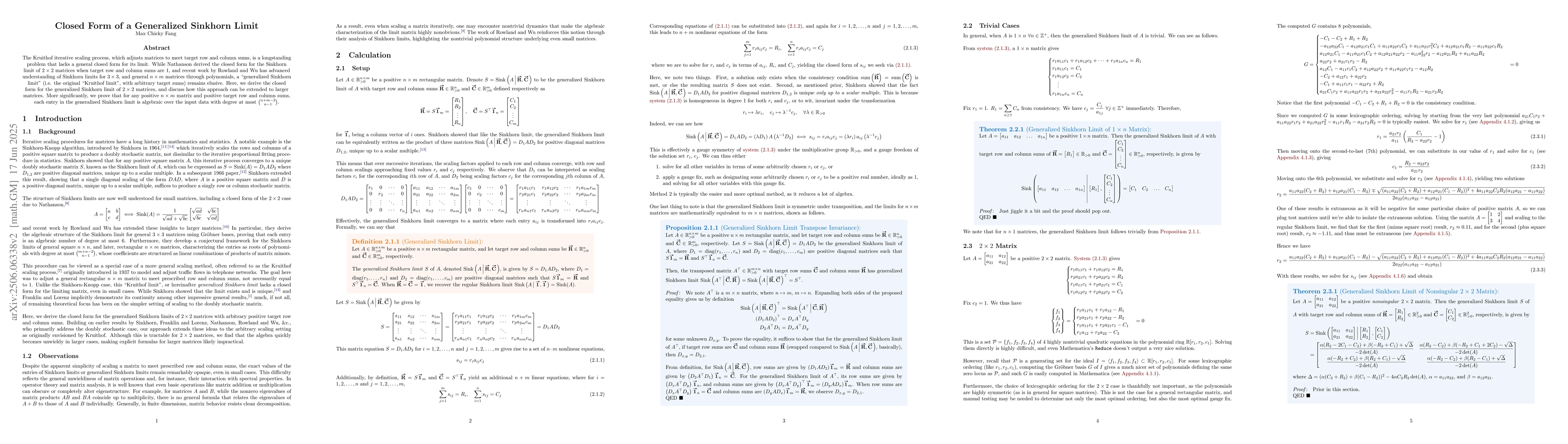 Researchers have derived a closed form solution for the generalized Sinkhorn limit of $2 imes 2$ matrices, providing insight into a longstanding problem in optimization theory. The study's findings also offer potential extensions to larger matrices and shed light on the algebraic properties of the resulting limits.