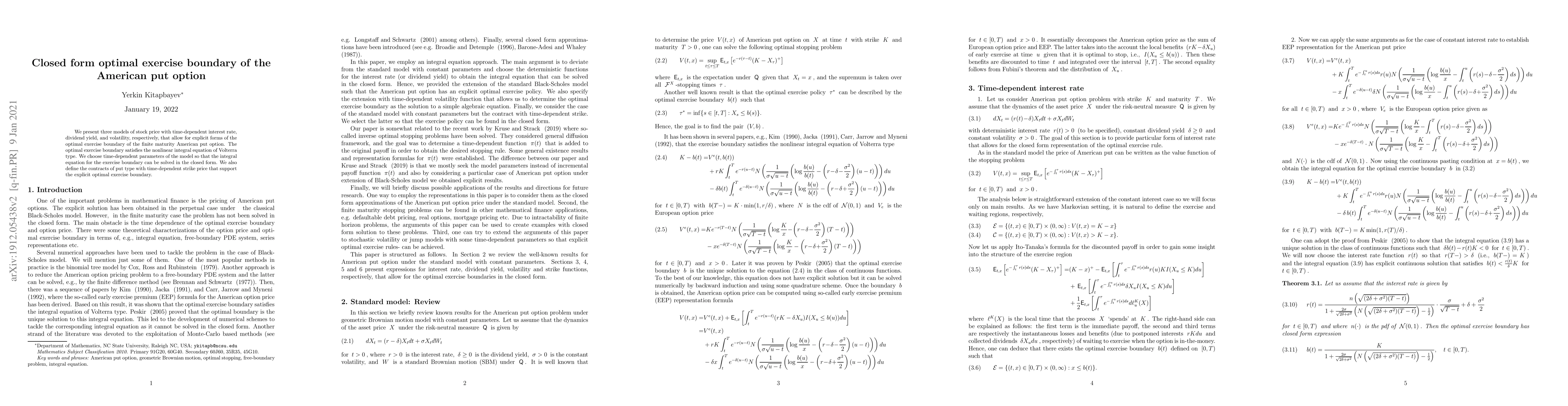 We present three models of stock price with time-dependent interest rate, dividend yield, and volatility, respectively, that allow for explicit forms of the optimal exercise boundary of the finite maturity American put option. The optimal exercise boundary satisfies the nonlinear integral equation of Volterra type. We choose time-dependent parameters of the model so that the integral equation for the exercise boundary can be solved in the closed form. We also define the contracts of put type with time-dependent strike price that support the explicit optimal exercise boundary.