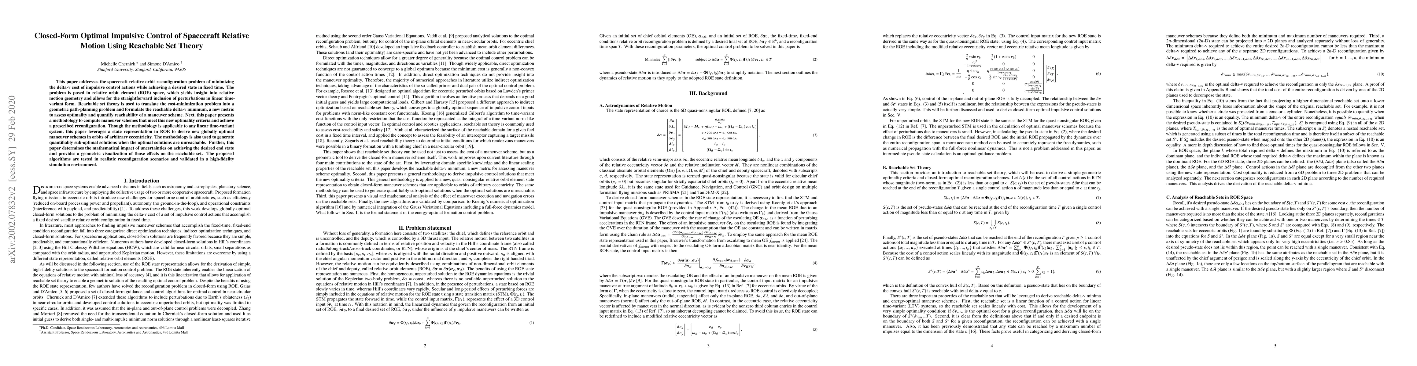 This paper develops a closed-form optimal impulsive control methodology for spacecraft relative motion reconfiguration using reachable set theory, minimizing delta-v cost and achieving desired states in fixed time. It presents a new metric and algorithms for globally optimal maneuvers, while also addressing uncertainties and sub-optimal solutions.