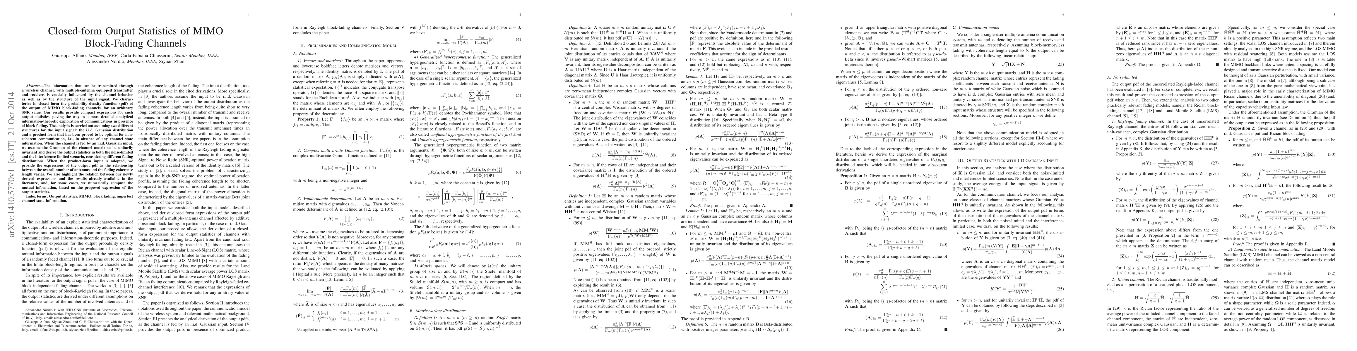 This paper derives closed-form expressions for the probability density function of the output of MIMO block-fading channels under different input signal structures, including i.i.d. Gaussian and product-form inputs. The results facilitate analytical information-theoretic studies of communication systems in block-fading environments.