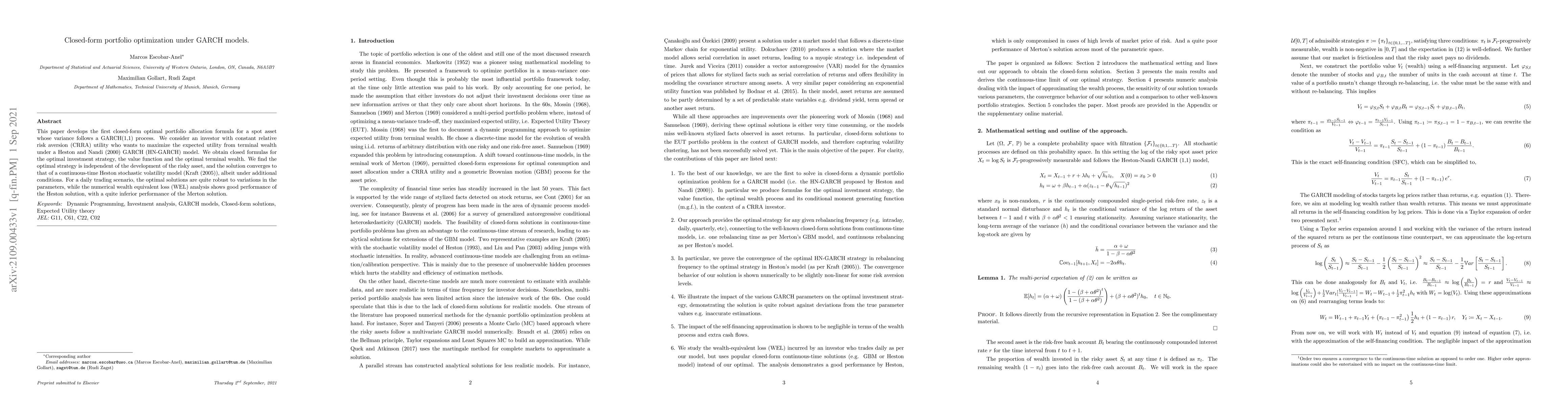 This paper develops a closed-form optimal portfolio allocation formula for investors with constant relative risk aversion under GARCH models, finding that the solution converges to a continuous-time Heston model and is robust to parameter variations.