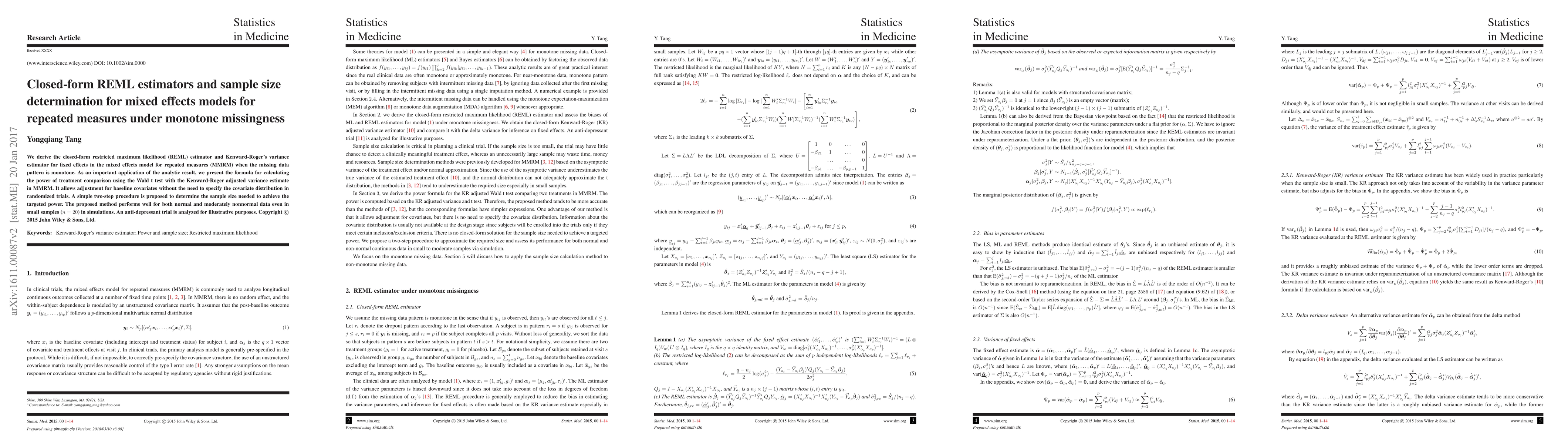 This paper derives closed-form REML estimators and Kenward-Roger's variance estimators for mixed effects models in repeated measures under monotone missingness. It also provides a formula for calculating power using the Wald t test and proposes a two-step procedure for sample size determination, validated through simulations and an anti-depressant trial.