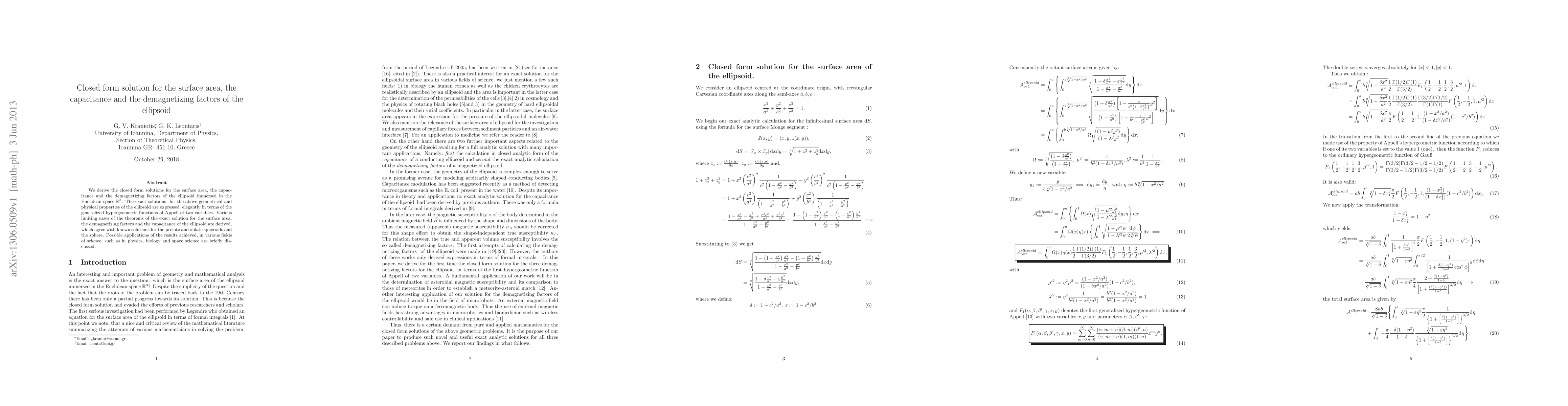 We derive the closed form solutions for the surface area, the capacitance and the demagnetizing factors of the ellipsoid immersed in the Euclidean space R^3. The exact solutions for the above geometrical and physical properties of the ellipsoid are expressed elegantly in terms of the generalized hypergeometric functions of Appell of two variables. Various limiting cases of the theorems of the exact solution for the surface area, the demagnetizing factors and the capacitance of the ellipsoid are derived, which agree with known solutions for the prolate and oblate spheroids and the sphere. Possible applications of the results achieved, in various fields of science, such as in physics, biology and space science are briefly discussed.