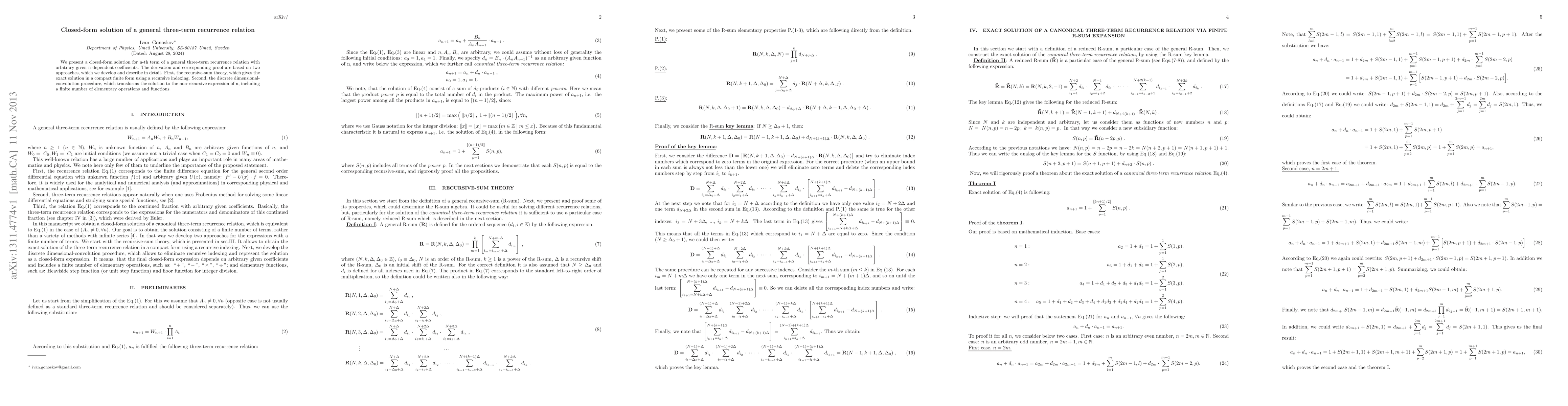 Researchers developed a closed-form solution for a general three-term recurrence relation with arbitrary n-dependent coefficients using two approaches: recursive-sum theory and discrete dimensional-convolution procedure.