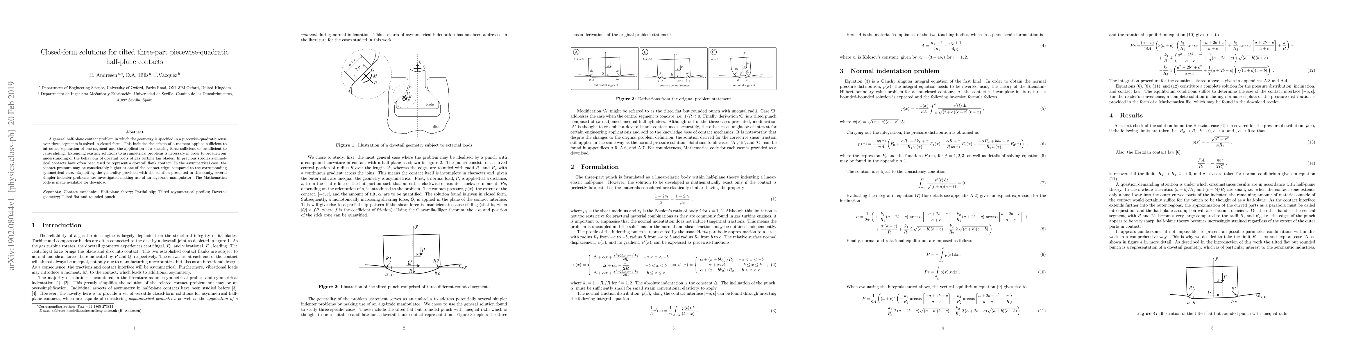 A general half-plane contact problem in which the geometry is specified in a piecewise-quadratic sense over three segments is solved in closed form. This includes the effects of a moment applied sufficient to introduce separation of one segment and the application of a shearing force sufficient or insufficient to cause sliding. Extending existing solutions to asymmetrical problems is necessary in order to broaden our understanding of the behaviour of dovetail roots of gas turbine fan blades. In previous studies symmetrical contacts have often been used to represent a dovetail flank contact. In the asymmetrical case, the contact pressure may be considerably higher at one of the contact edges compared to the corresponding symmetrical case. Exploiting the generality provided with the solution presented in this study, several simpler indenter problems are investigated making use of an algebraic manipulator. The Mathematica code is made available for download.