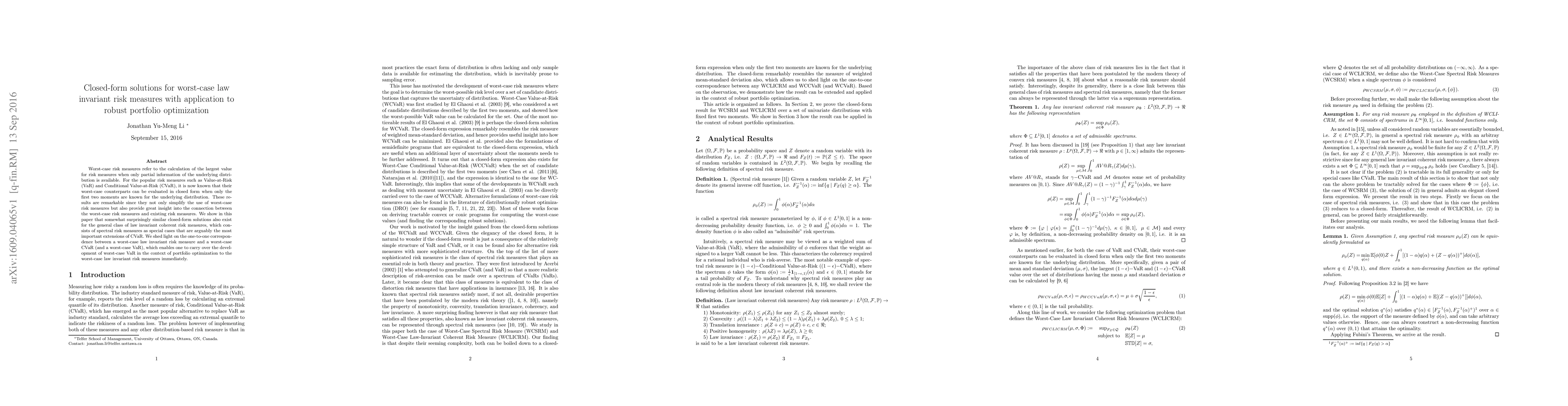 This paper presents closed-form solutions for worst-case law invariant risk measures, extending the known results for Value-at-Risk (VaR) and Conditional Value-at-Risk (CVaR) to a broader class of risk measures. This advancement facilitates robust portfolio optimization by simplifying the evaluation of worst-case scenarios.
