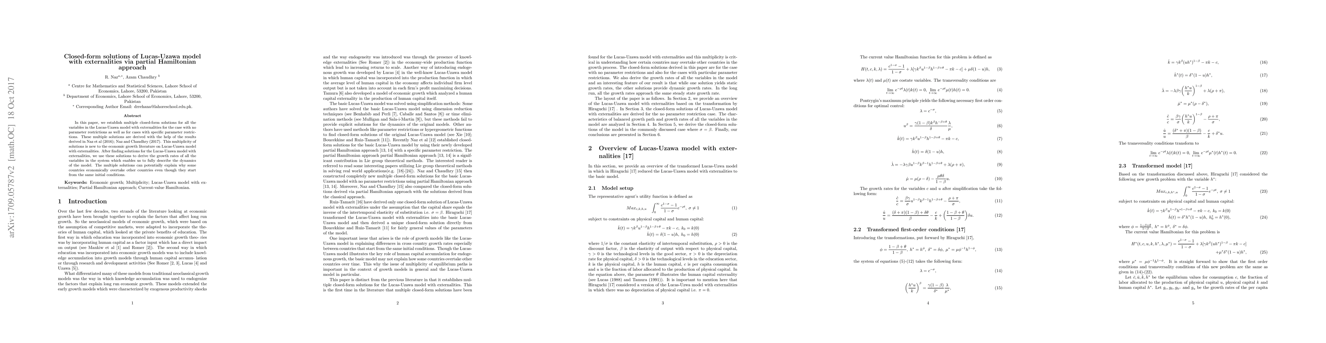 This paper presents closed-form solutions for variables in the Lucas-Uzawa economic growth model, incorporating externalities without parameter restrictions, and with specific restrictions. Utilizing results from previous studies, the research reveals multiple solutions, offering new insights into economic overtaking among nations. The findings describe the model's dynamics through growth rates of all variables.