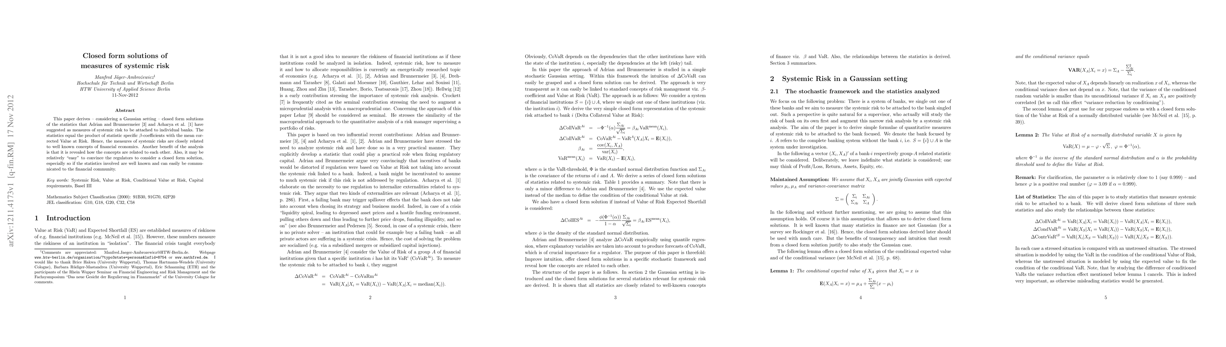 This paper derives -- considering a Gaussian setting -- closed form solutions of the statistics that Adrian and Brunnermeier and Acharya et al. have suggested as measures of systemic risk to be attached to individual banks. The statistics equal the product of statistic specific Beta-coefficients with the mean corrected Value at Risk. Hence, the measures of systemic risks are closely related to well known concepts of financial economics. Another benefit of the analysis is that it is revealed how the concepts are related to each other. Also, it may be relatively easy to convince the regulators to consider a closed form solution, especially so if the statistics involved are well known and can easily be communicated to the financial community.