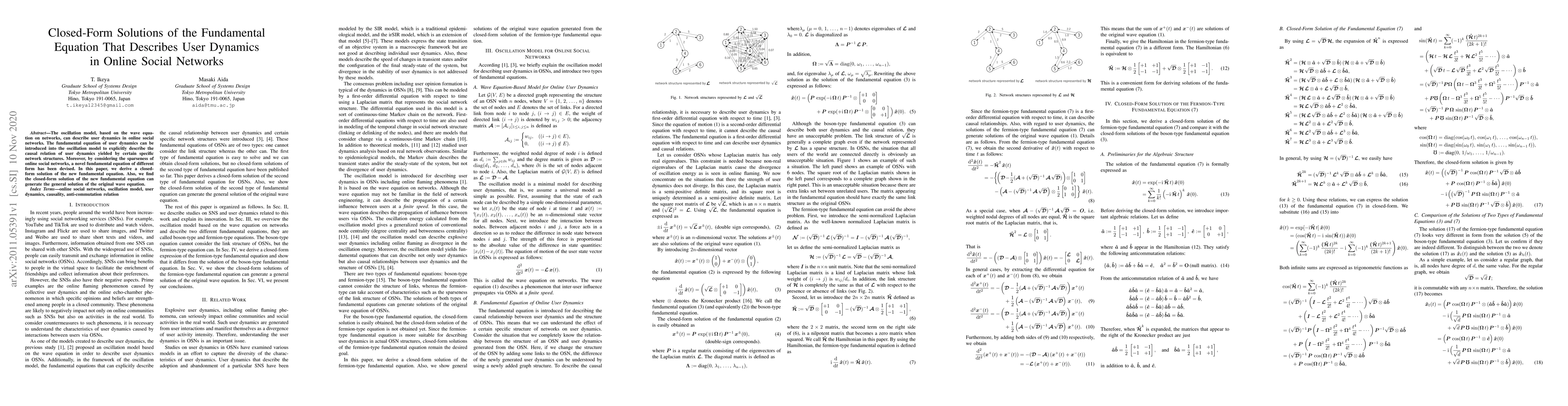 This paper develops a closed-form solution for a novel fundamental equation describing user dynamics in online social networks, based on an oscillation model incorporating network structure. The derived solution also generalizes the original wave equation used to model these dynamics.