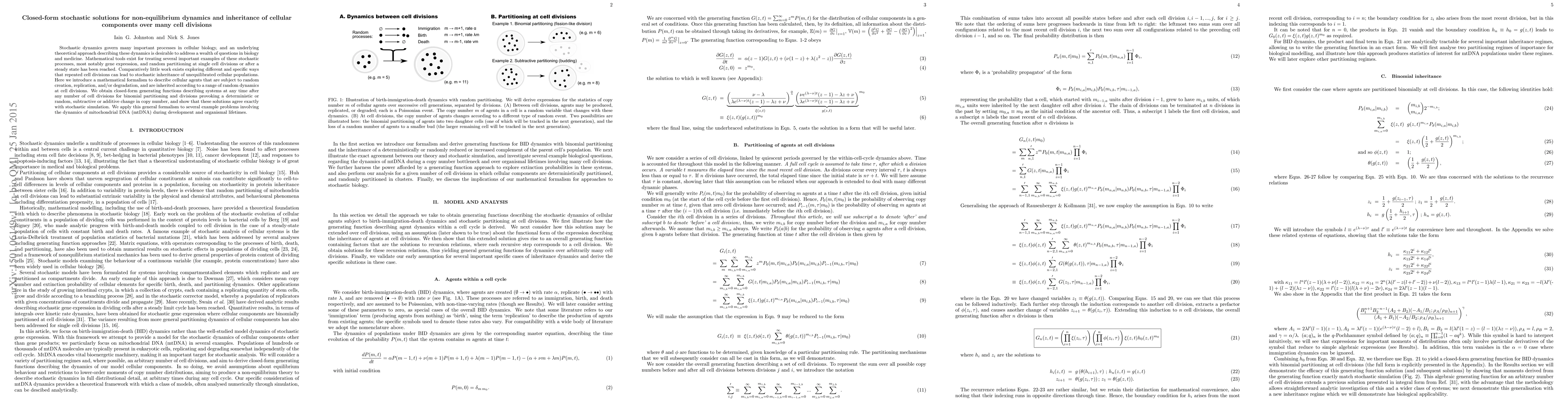 This paper develops a mathematical formalism to describe stochastic dynamics in cellular biology, specifically focusing on the inheritance of cellular components over many cell divisions. It provides closed-form solutions for systems undergoing random partitioning and copy number changes, validated through agreement with stochastic simulations, and applies the model to mitochondrial DNA dynamics.