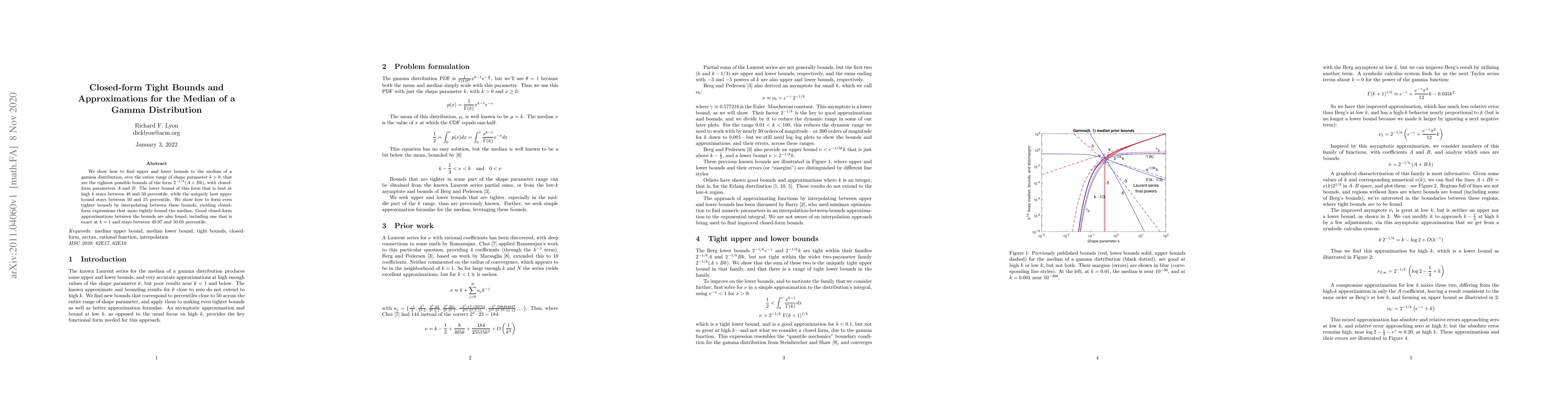 This paper presents closed-form tight bounds and approximations for the median of a gamma distribution. It finds the tightest possible bounds of the form \(2^{-1/k}(A + Bk)\) with closed-form parameters \(A\) and \(B\), and provides a method to interpolate between these bounds for even tighter bounds.