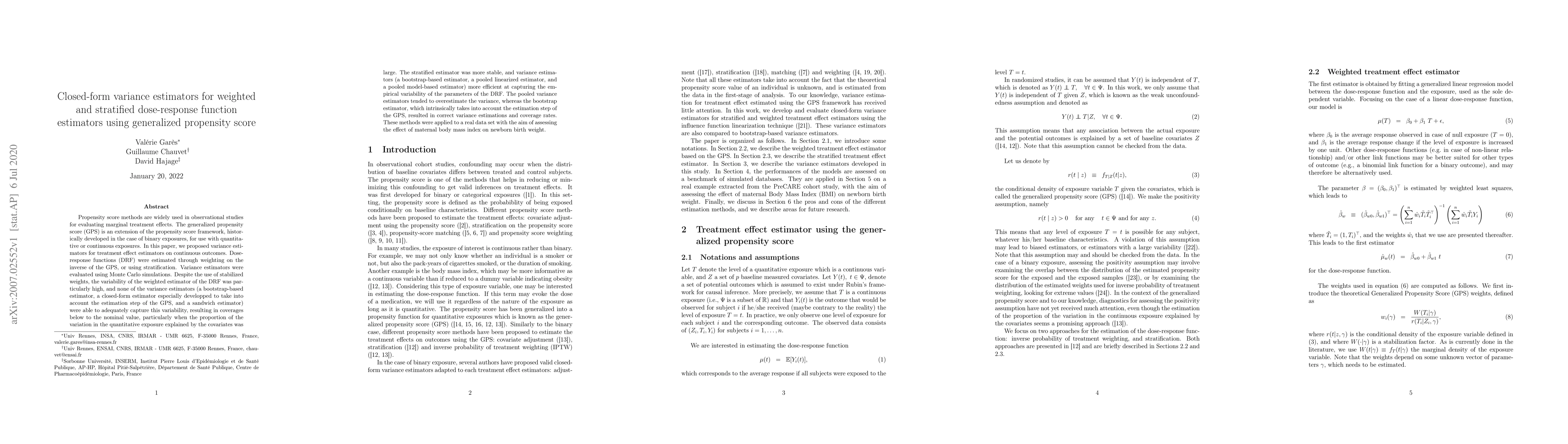 Propensity score methods are widely used in observational studies for evaluating marginal treatment effects. The generalized propensity score (GPS) is an extension of the propensity score framework, historically developed in the case of binary exposures, for use with quantitative or continuous exposures. In this paper, we proposed variance esti-mators for treatment effect estimators on continuous outcomes. Dose-response functions (DRF) were estimated through weighting on the inverse of the GPS, or using stratification. Variance estimators were evaluated using Monte Carlo simulations. Despite the use of stabilized weights, the variability of the weighted estimator of the DRF was particularly high, and none of the variance estimators (a bootstrap-based estimator, a closed-form estimator especially developped to take into account the estimation step of the GPS, and a sandwich estimator) were able to adequately capture this variability, resulting in coverages below to the nominal value, particularly when the proportion of the variation in the quantitative exposure explained by the covariates was 1 large. The stratified estimator was more stable, and variance estima-tors (a bootstrap-based estimator, a pooled linearized estimator, and a pooled model-based estimator) more efficient at capturing the empirical variability of the parameters of the DRF. The pooled variance estimators tended to overestimate the variance, whereas the bootstrap estimator, which intrinsically takes into account the estimation step of the GPS, resulted in correct variance estimations and coverage rates. These methods were applied to a real data set with the aim of assessing the effect of maternal body mass index on newborn birth weight.