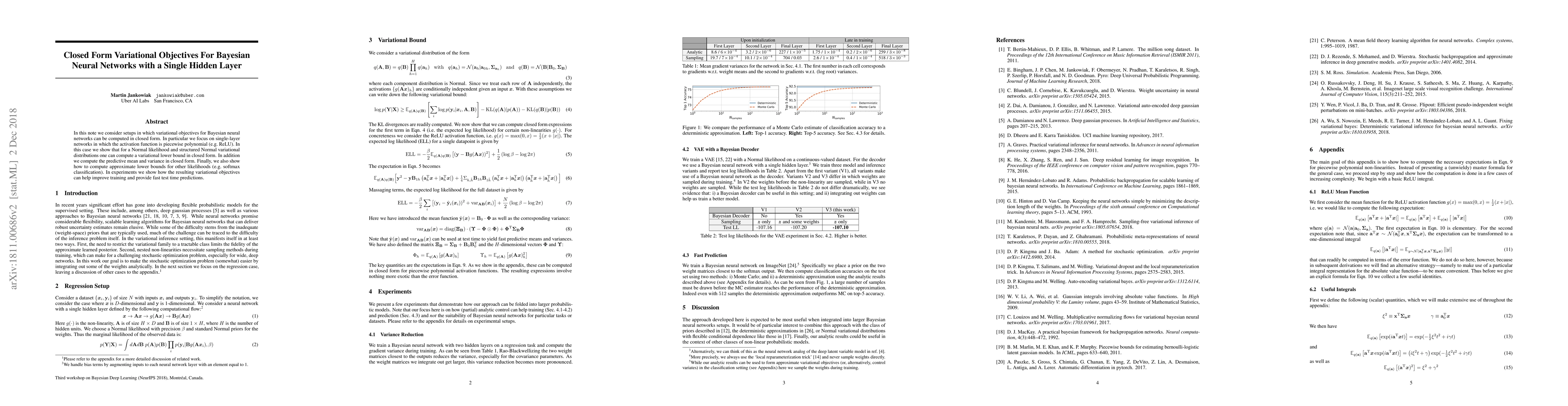 This research presents a method to compute variational objectives for Bayesian neural networks with a single hidden layer and piecewise polynomial activation functions (like ReLU) in closed form. It also derives closed-form expressions for predictive mean and variance, and provides approximate bounds for other likelihoods, demonstrating improved training and fast test-time predictions in experiments.