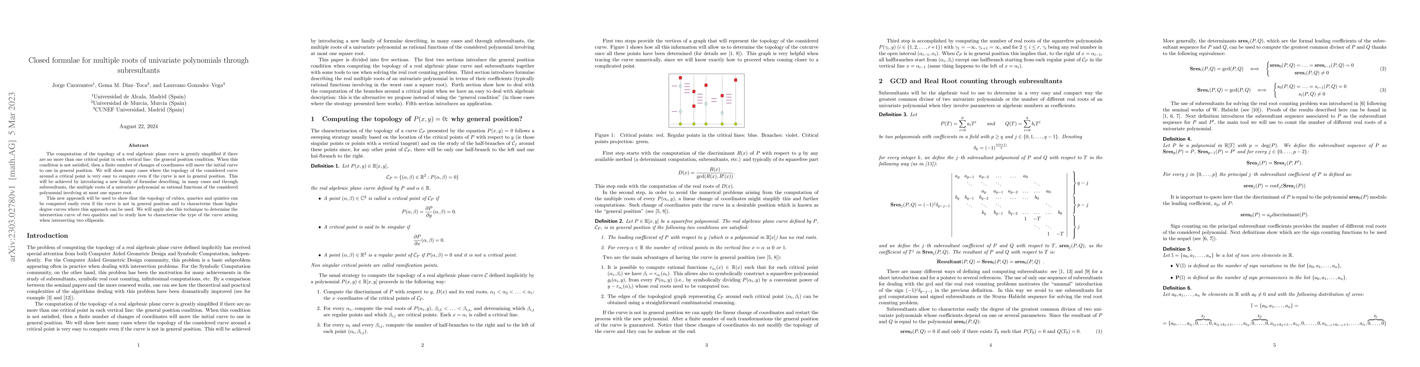 The computation of the topology of a real algebraic plane curve is greatly simplified if there are no more than one critical point in each vertical line: the general position condition. When this condition is not satisfied, then a finite number of changes of coordinates will move the initial curve to one in general position. We will show many cases where the topology of the considered curve around a critical point is very easy to compute even if the curve is not in general position. This will be achieved by introducing a new family of formulae describing, in many cases and through subresultants, the multiple roots of a univariate polynomial as rational functions of the considered polynomial involving at most one square root. This new approach will be used to show that the topology of cubics, quartics and quintics can be computed easily even if the curve is not in general position and to characterise those higher degree curves where this approach can be used. We will apply also this technique to determine the intersection curve of two quadrics and to study how to characterise the type of the curve arising when intersecting two ellipsoids.