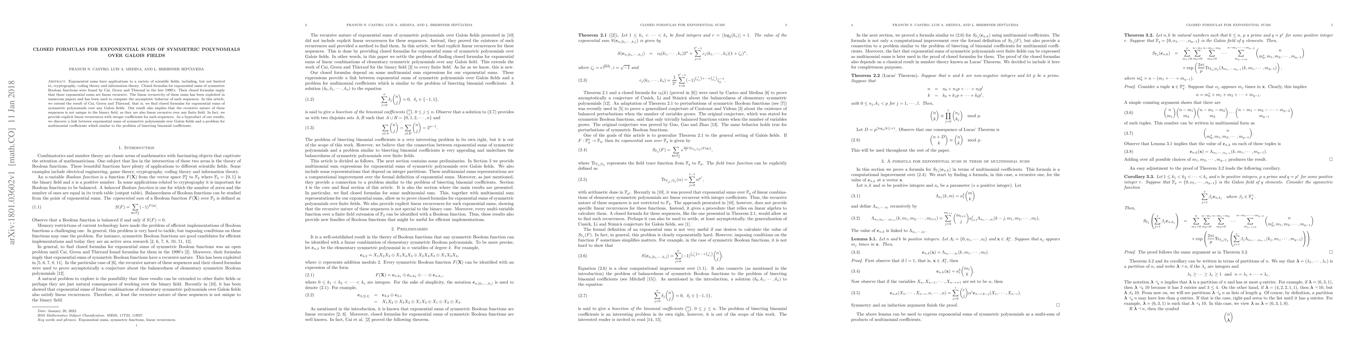 This paper develops closed formulas for exponential sums of symmetric polynomials over any Galois field, extending earlier work on Boolean functions. It reveals these sums' linear recursive nature across all finite fields and provides explicit recurrences, with a side finding linking these sums to multinomial coefficients.