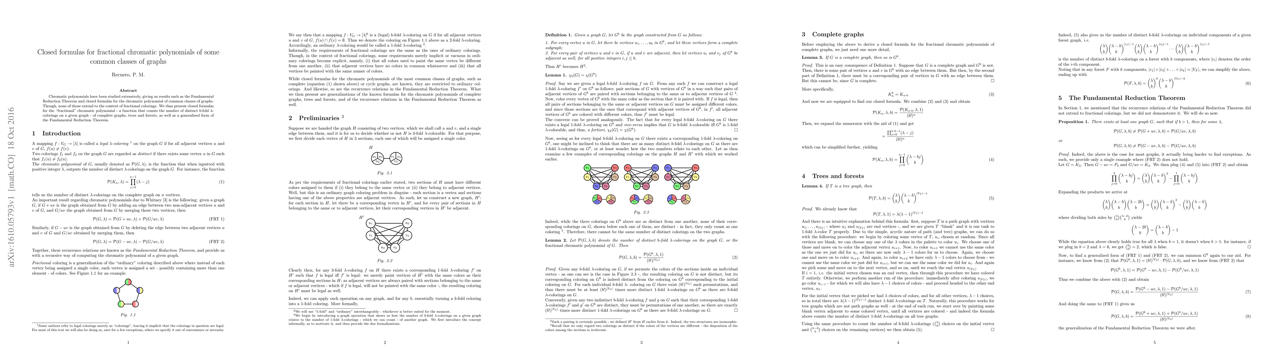 Chromatic polynomials have been studied extensively, giving us results such as the Fundamental Reduction Theorem and closed formulas for the chromatic polynomials of common classes of graphs. Though, none of those extend to the context of fractional colorings. We thus present closed formulas for the "fractional" chromatic polynomial - a function that counts the number of distinct $b$-fold $\lambda$-colorings on a given graph - of complete graphs, trees and forests, as well as a generalized form of the Fundamental Reduction Theorem.