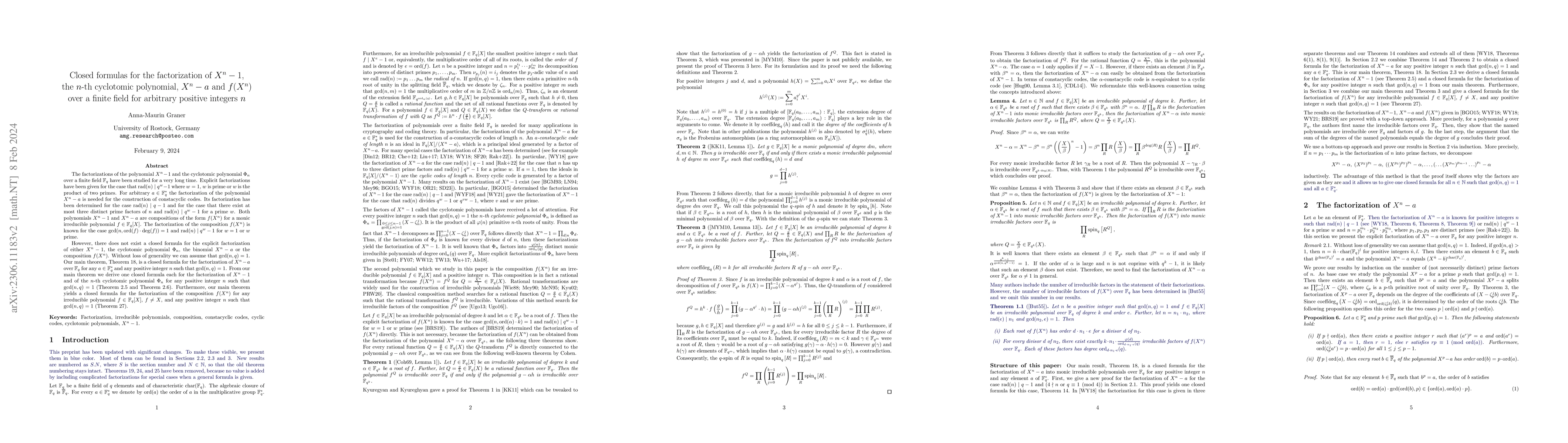 This paper presents closed formulas for the factorization of $X^n-1$, the $n$-th cyclotomic polynomial, $X^n-a$, and $f(X^n)$ over a finite field $\mathbb F_q$. The authors derive a main theorem providing explicit factorizations for these polynomials under certain conditions, extending previous results.