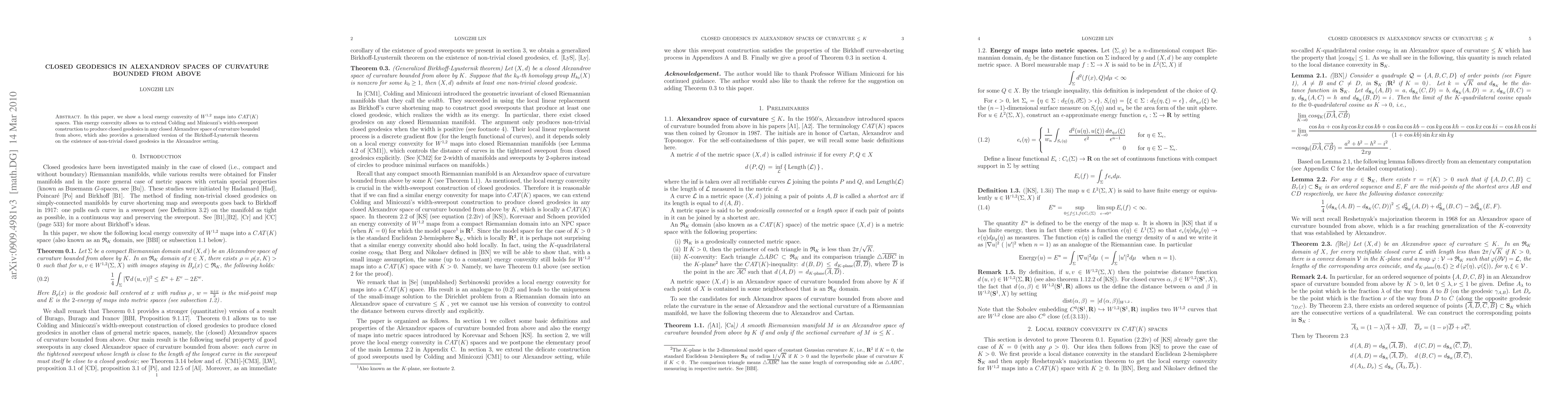 In this paper, we show a local energy convexity of $W^{1,2}$ maps into $CAT(K)$ spaces. This energy convexity allows us to extend Colding and Minicozzi's width-sweepout construction to produce closed geodesics in any closed Alexandrov space of curvature bounded from above, which also provides a generalized version of the Birkhoff-Lyusternik theorem on the existence of non-trivial closed geodesics in the Alexandrov setting.