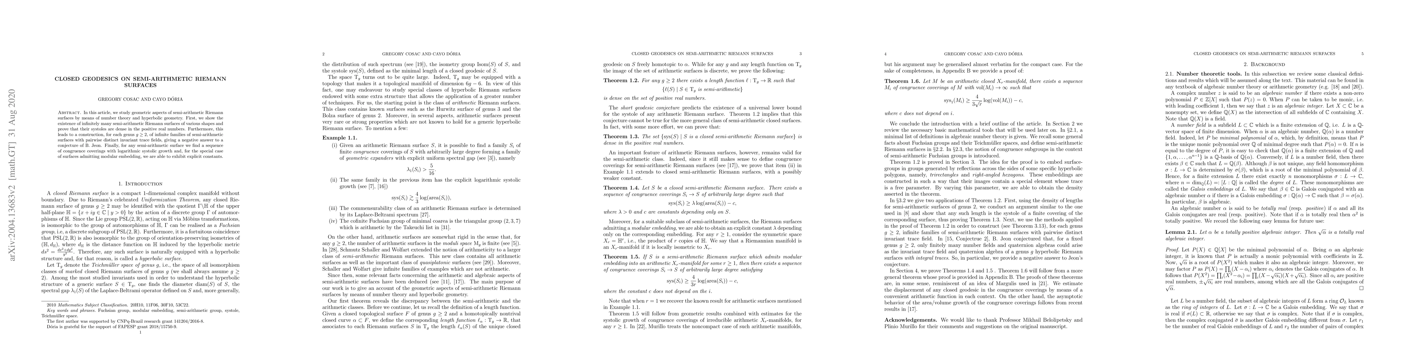 This paper explores the geometric properties of semi-arithmetic Riemann surfaces using number theory and hyperbolic geometry, proving the existence of infinitely many such surfaces with dense systoles. It also constructs families of surfaces with distinct invariant trace fields, refuting a conjecture, and finds sequences of congruence coverings with logarithmic growth.
