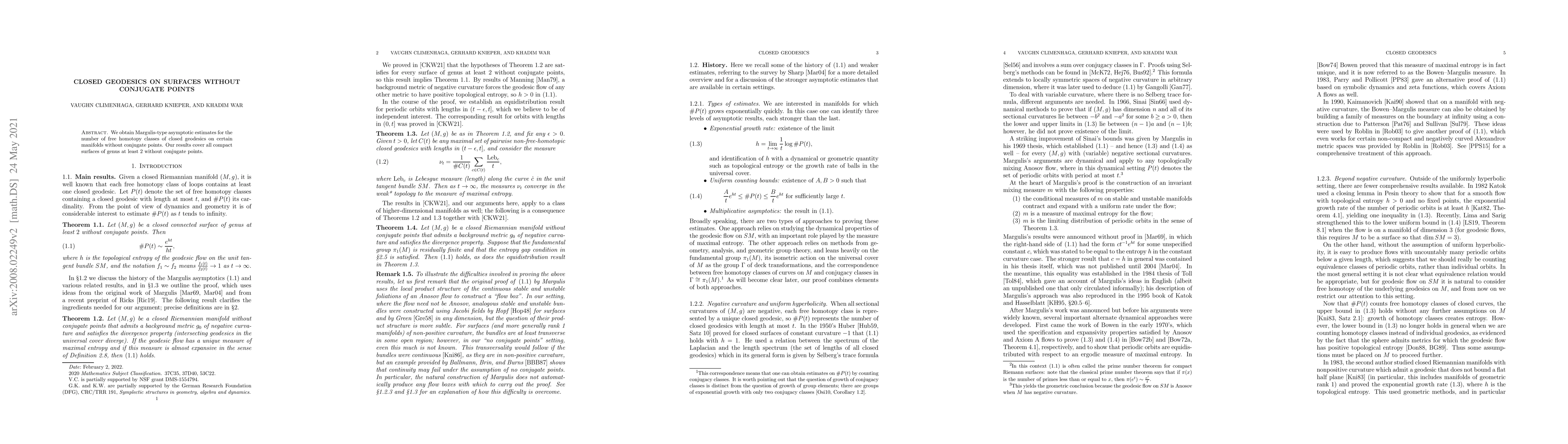 Summary: This paper provides Margulis-type asymptotic estimates for the number of free homotopy classes of closed geodesics on compact surfaces of genus at least 2 that lack conjugate points. The results apply to all such manifolds without conjugate points.