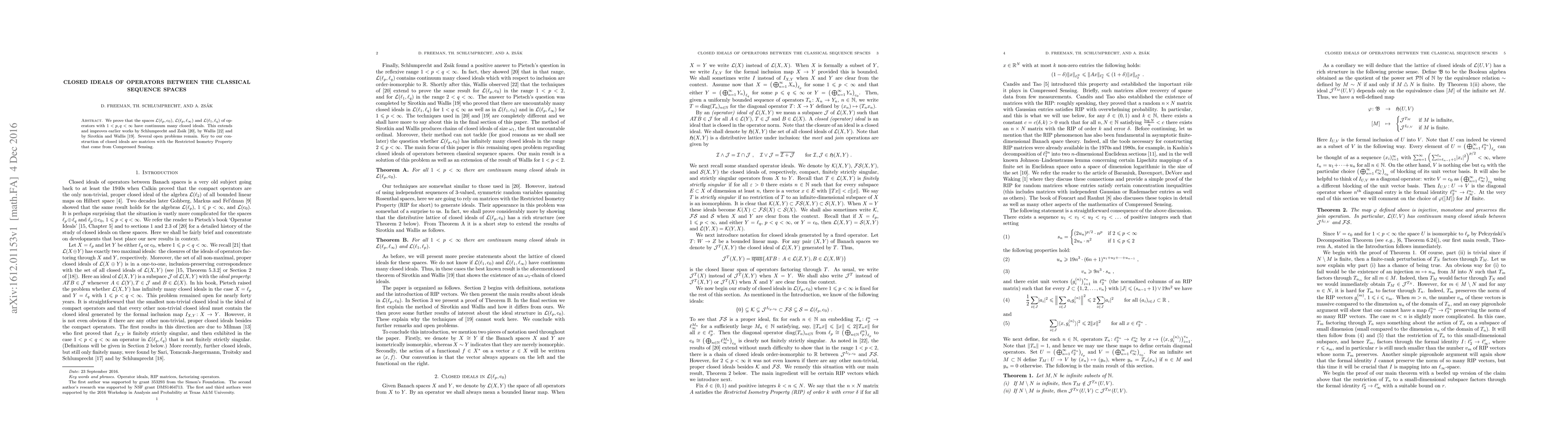 This paper demonstrates that the operator spaces $\mathcal L(\ell_p,\mathrm{c}_0)$, $\mathcal L(\ell_p,\ell_\infty)$, and $\mathcal L(\ell_1,\ell_q)$ possess a continuum of closed ideals, extending previous results. The construction leverages matrices with the Restricted Isometry Property from Compressed Sensing.