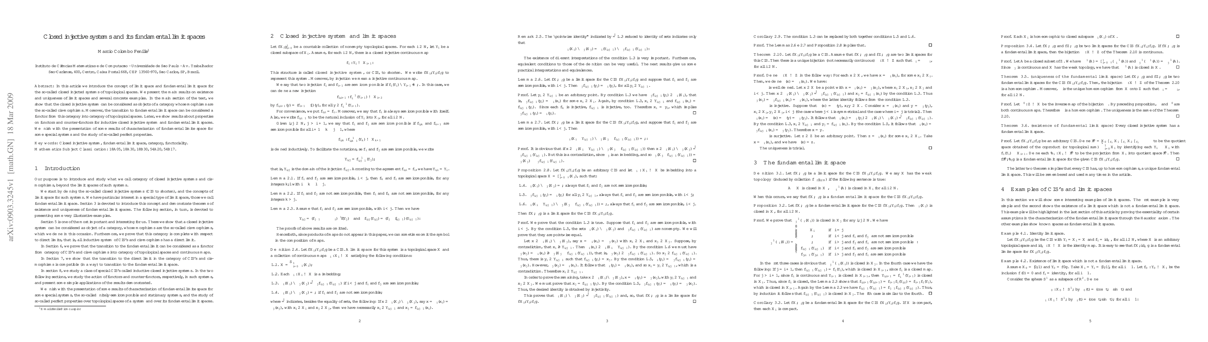 In this article we introduce the concept of limit space and fundamental limit space for the so-called closed injected systems of topological spaces. We present the main results on existence and uniqueness of limit spaces and several concrete examples. In the main section of the text, we show that the closed injective system can be considered as objects of a category whose morphisms are the so-called cis-morphisms. Moreover, the transition to fundamental limit space can be considered a functor from this category into category of topological spaces. Later, we show results about properties on functors and counter-functors for inductive closed injective system and fundamental limit spaces. We finish with the presentation of some results of characterization of fundamental limite space for some special systems and the study of so-called perfect properties.