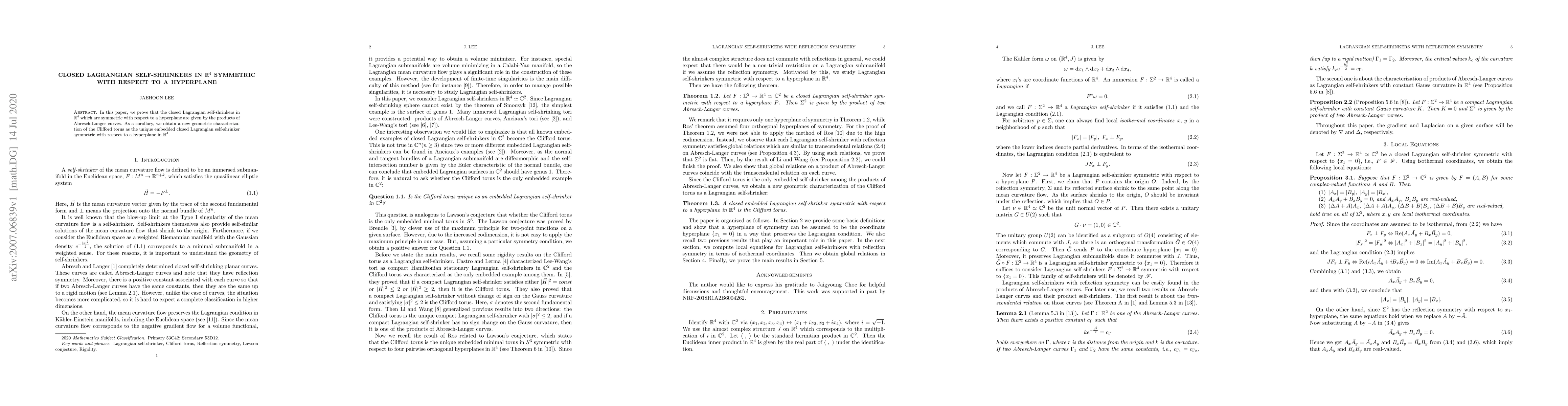 Researchers prove that closed Lagrangian self-shrinkers in $ extbf{R}^4$ symmetric with respect to a hyperplane can be represented as products of Abresch-Langer curves, leading to a new characterization of the Clifford torus.