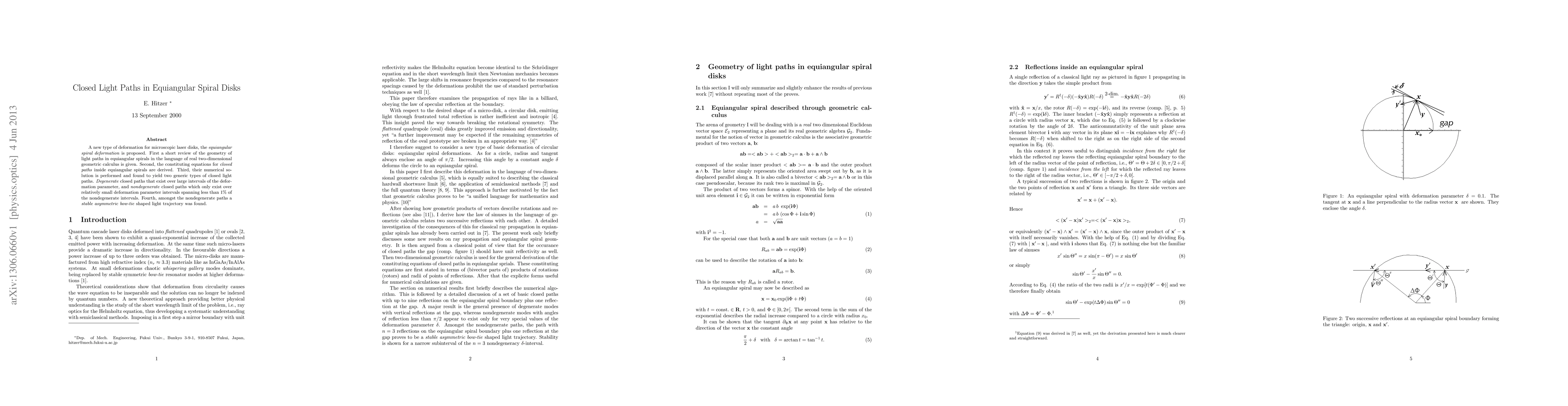 A new type of deformation for microscopic laser disks, the \textit{equiangular spiral deformation} is proposed. First a short review of the geometry of light paths in equiangular spirals in the language of real two-dimensional geometric calculus is given. Second, the constituting equations for \textit{closed paths} inside equiangular spirals are derived. Third, their numerical solution is performed and found to yield two generic types of closed light paths. \textit{Degenerate} closed paths that exist over large intervals of the deformation parameter, and \textit{nondegenerate} closed paths which only exist over relatively small deformation parameter intervals spanning less than 1% of the nondegenerate intervals. Fourth, amongst the nondegenerate paths a \textit{stable asymmetric bow-tie} shaped light trajectory was found.