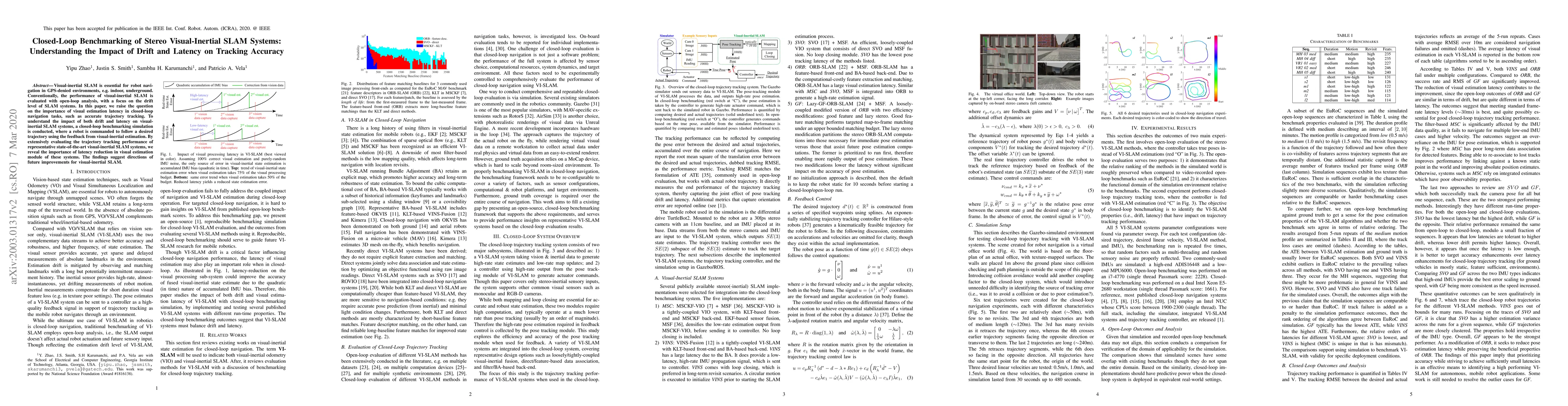 The paper presents a closed-loop benchmarking framework for visual-inertial SLAM systems, focusing on trajectory tracking performance and the impact of drift and latency.